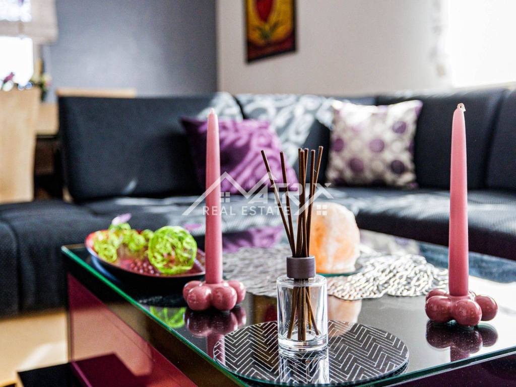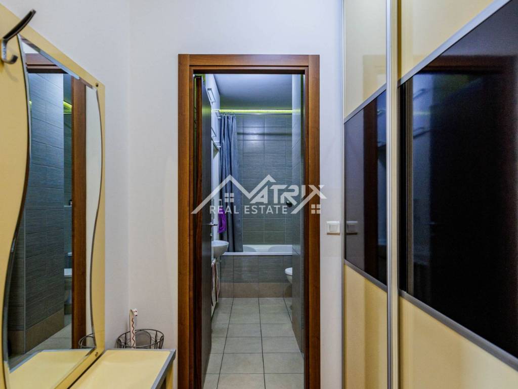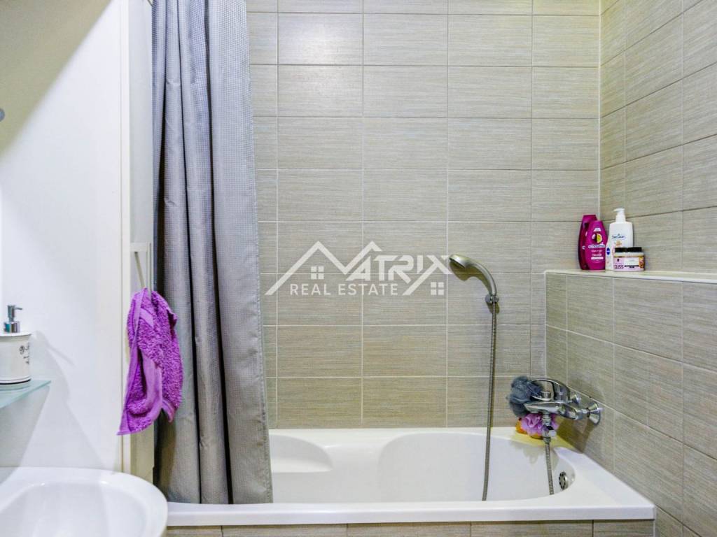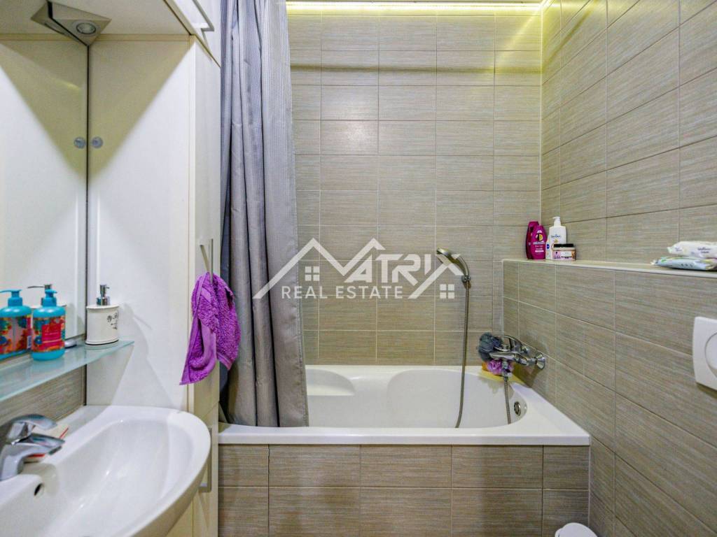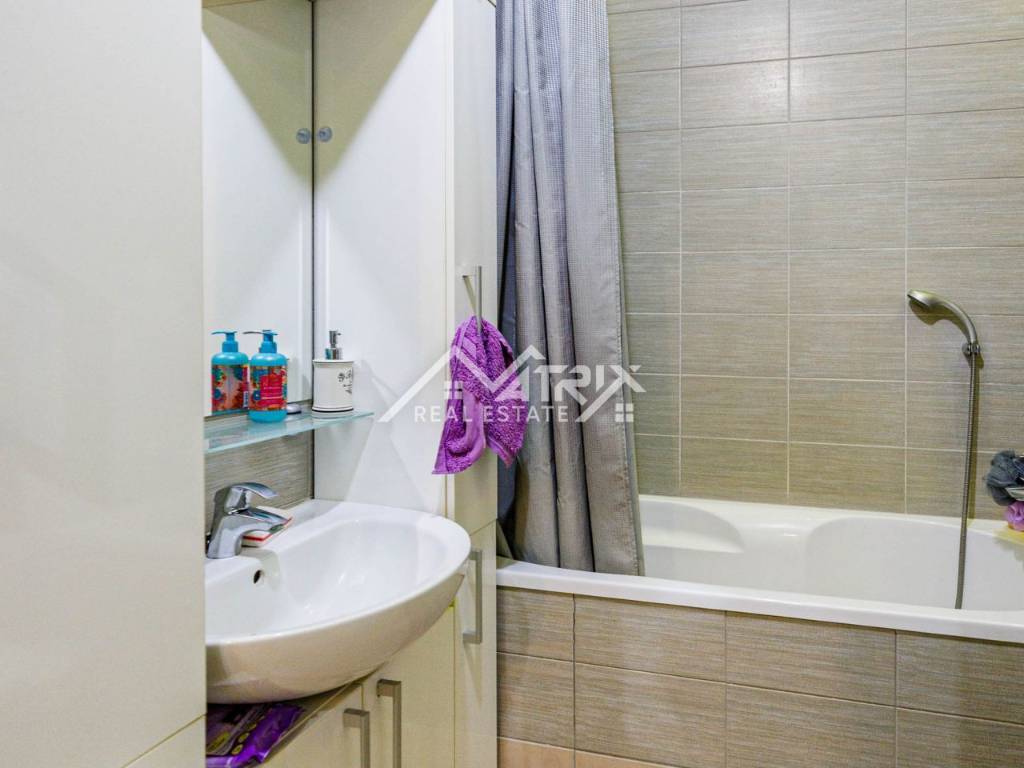 The apartment consists of an entrance hallway, a living room connected to the dining area and a fully equipped kitchen, two bedrooms – a master and a children’s room, a bathroom with a bathtub, and a covered balcony perfect for relaxing. Additionally, it includes a basement storage unit and a designated parking space.