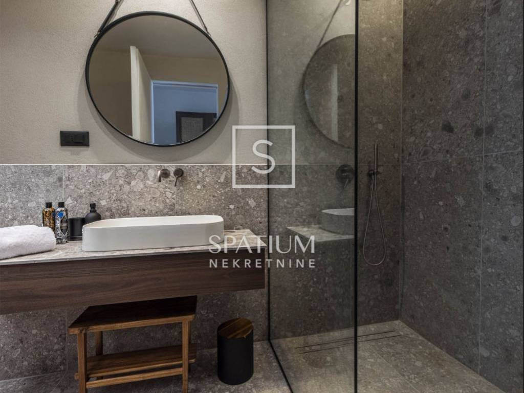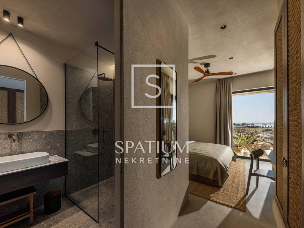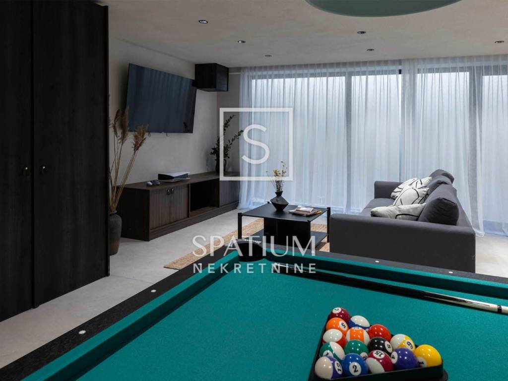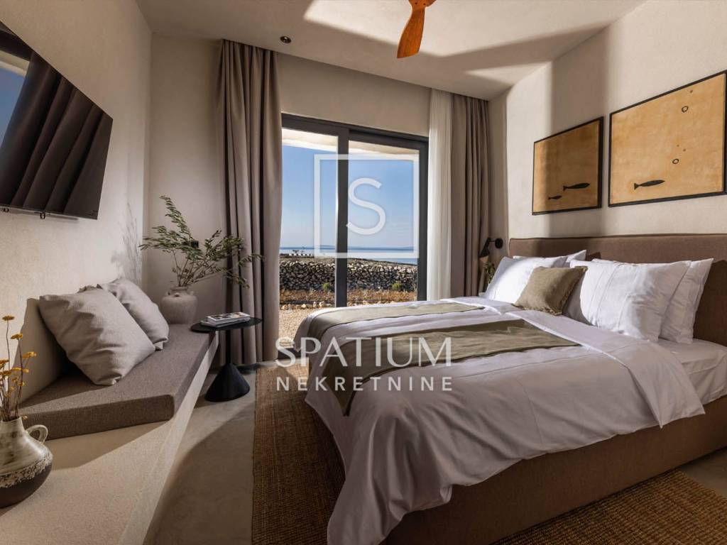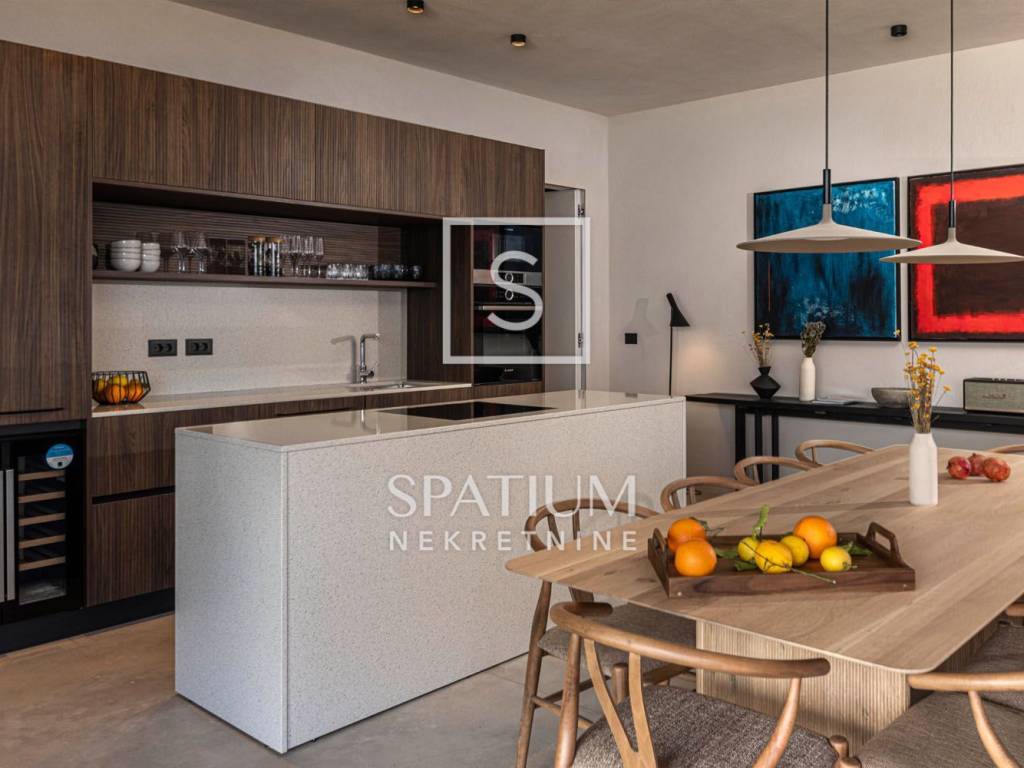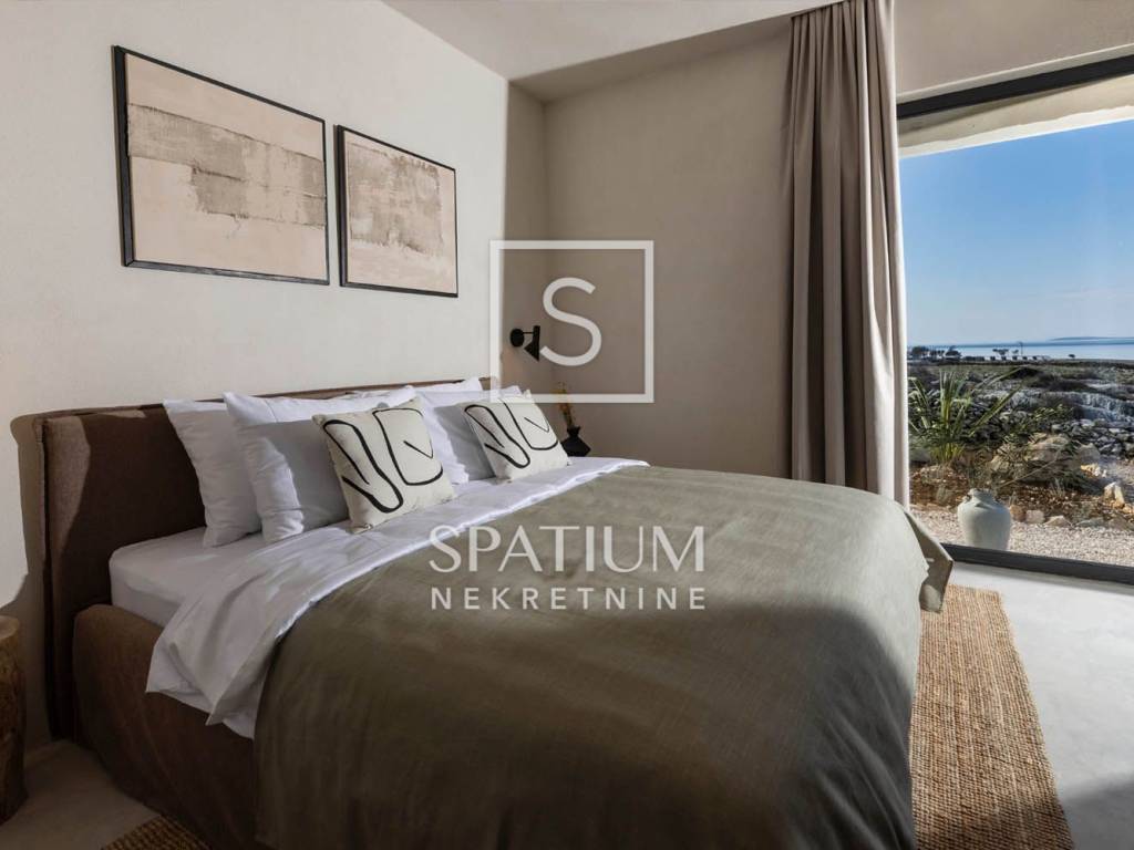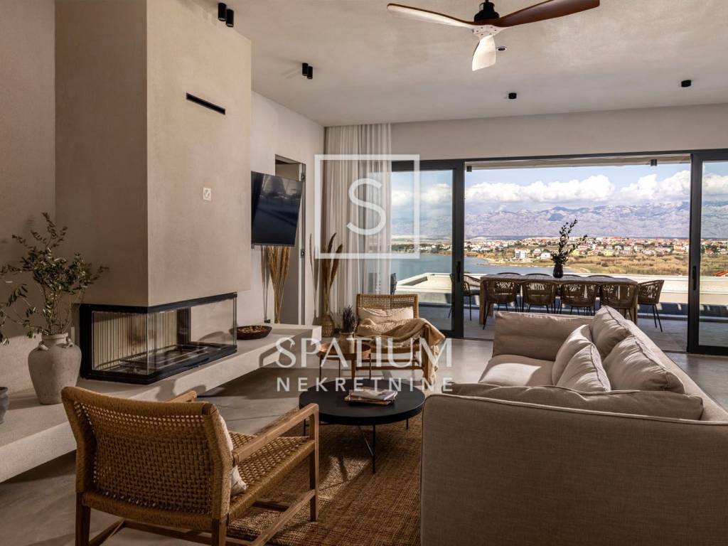PAG, abbiamo ricevuto un'offerta per una villa di nuova costruzione a un piano con una superficie di 341 m2 su un terreno con una superficie totale di 1081 m2. È composto da un soggiorno open space, sala da pranzo e cucina, un bagno, una sala giochi, un ripostiglio e quattro camere da letto con bagno privato e cabina doccia. Il giardino dispone di una zona relax, di una zona solarium e di una piscina a sfioro riscaldata di 70 m² con vista sulla baia e sulle montagne. Nel cortile si trovano due posti auto scoperti dotati di stazione di ricarica per veicoli elettrici (Wallbox) e un giardino piantumato con piante mediterranee in prossimità del mare. Nella costruzione sono stati utilizzati materiali e arredi di qualità, quali: sanitari Galassia, miscelatori Pan Zuchetti, piastrelle in ceramica, serramenti in alluminio - vetro rinforzato doppio strato - argon, porte interne senza telaio Pivato, illuminazione Foscarini - Aplomb nella sala da pranzo, elettrodomestici da cucina Bosch, cucina Veneta Cucine. Il riscaldamento e il raffreddamento sono garantiti da una pompa di calore, dal riscaldamento elettrico a pavimento, da unità di aria condizionata e da ventilatori a soffitto Faro in ogni camera da letto e soggiorno, mentre la piscina esterna è riscaldata da una pompa di calore separata. Grazie alla sua microposizione e al buon collegamento con la terraferma tramite ponte, che la rende facilmente accessibile, rappresenta un'opportunità ideale per una moderna vita familiare in un ambiente naturale e per dedicarsi ad attività turistiche.