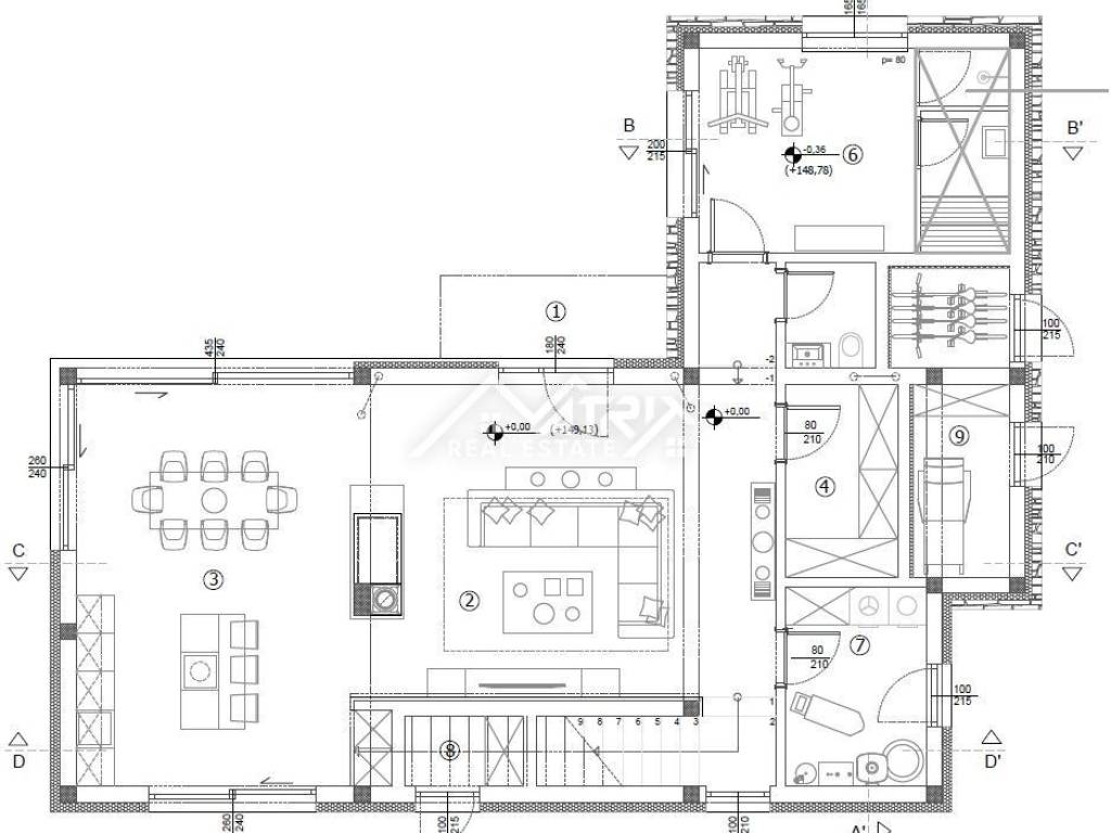 The house is spread over two floors: ground floor and first floor. The central part of the ground floor is a large space that unites the living room with dining room and kitchen, with access to the covered outdoor dining area through large glass walls, which provide plenty of daylight throughout the day. The ground floor also has toilets, a wardrobe, technical rooms for heating, and a laundry room equipped with all necessary connections. There are also rooms for storing personal belongings, bicycles and mobile equipment for the garden and pool. An additional feature of the ground floor is a large wellness area with a sauna and shower, with access to the pool terrace.
