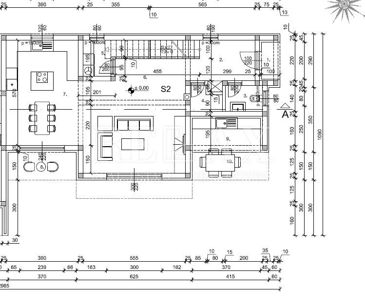 La villa si sviluppa su tre piani. Al seminterrato si trova un garage di 45,5 m² con capacità per due auto e la centrale termica. Il piano terra è concepito come una spaziosa zona giorno composta da ingresso, bagno, lavanderia, ripostiglio e cucina con sala da pranzo. La cucina e il soggiorno si aprono direttamente su un’ampia terrazza con piscina, solarium e cucina estiva coperta attrezzata con barbecue e zona pranzo all’aperto – ideale per incontri estivi con vista mare.