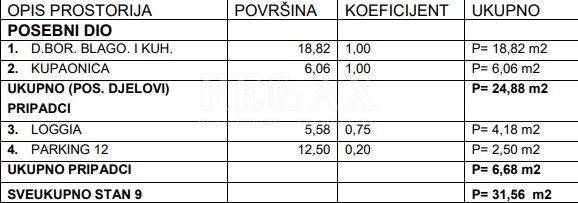 La superficie abitabile del monolocale è di 24,88 m² e comprende uno spazio aperto con soggiorno, cucina e zona pranzo, oltre a un bagno. Dal soggiorno si accede a una loggia di 4,18 m², che offre uno spazio esterno aggiuntivo per il relax. L'appartamento dispone inoltre di un posto auto esterno di 2,50 m² nel cortile dell'edificio.