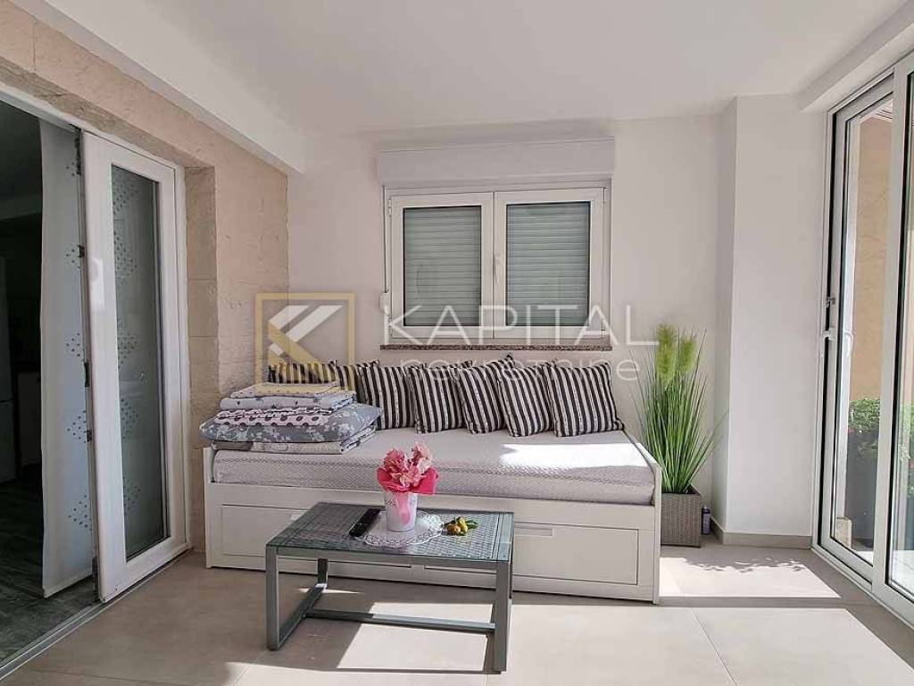 L'appartamento è realizzato in un edificio separato. Uno speciale vialetto conduce ad un ampio terrazzo fiorito. Lo spazio interno è composto da una camera da letto, bagno, cucina e soggiorno con accesso al giardino. Venduto arredato e completamente attrezzato.