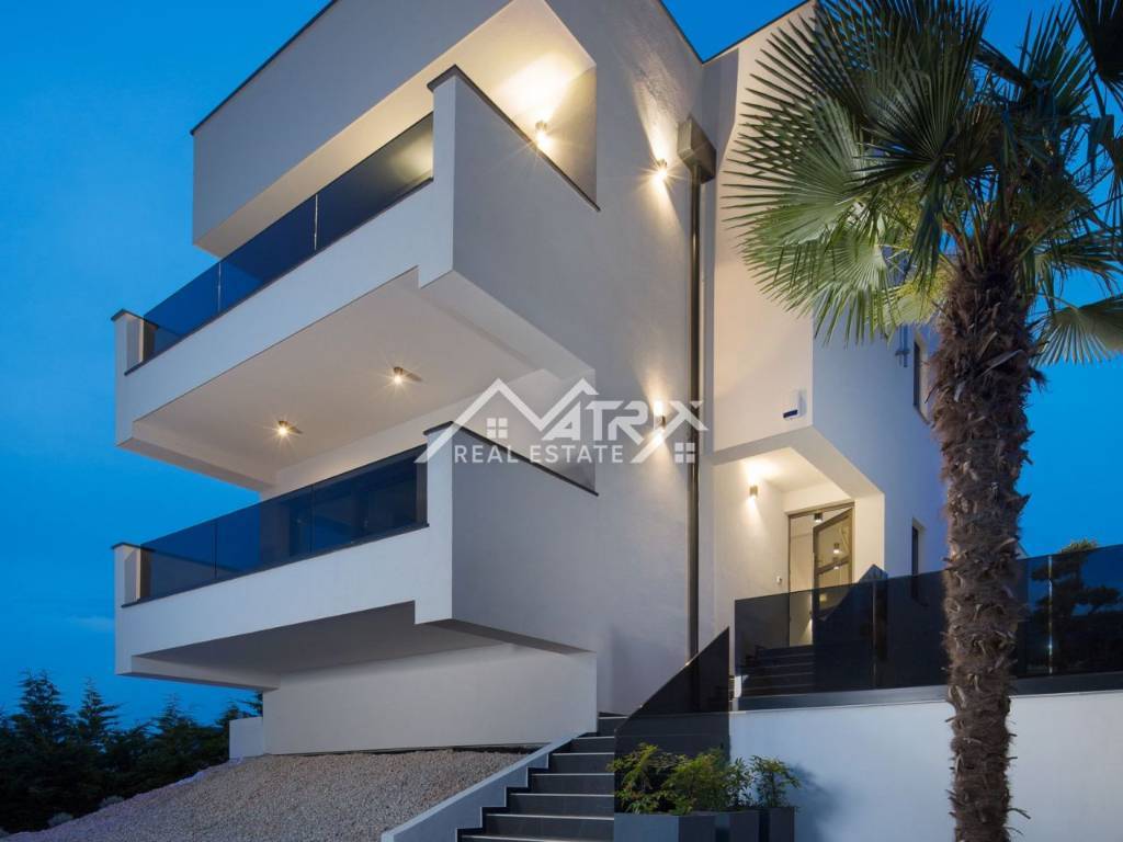 The house is spread over three floors: the basement, ground floor, and first floor. The central part of the ground floor is a large space that unites the living room with the dining room and the kitchen, with access to the covered pool terrace through large glass walls, which provide plenty of daylight. On the ground floor, there is also one bedroom with its own bathroom and guest toilet. Modern stairs lead us to the first floor, where there are three fully equipped bedrooms, each with its own bathroom and terrace. From every room and from every terrace there is a beautiful open view of the sea and the landscape. In the basement, there is a game room with a pool table and a PlayStation unit, as well as a boiler room and a storage room.