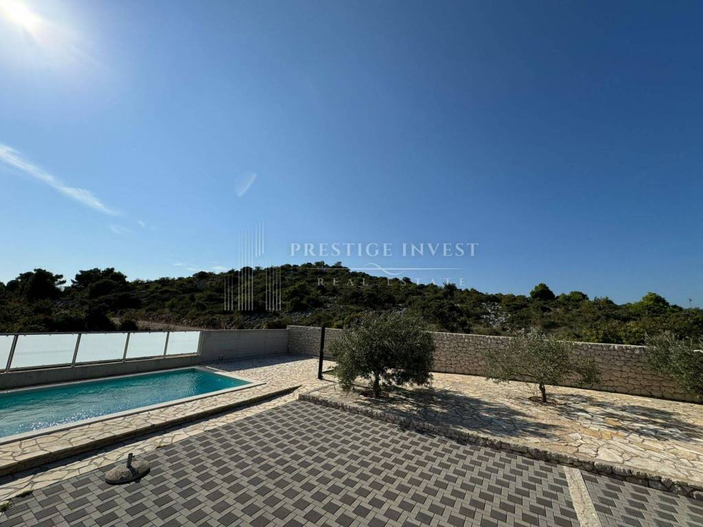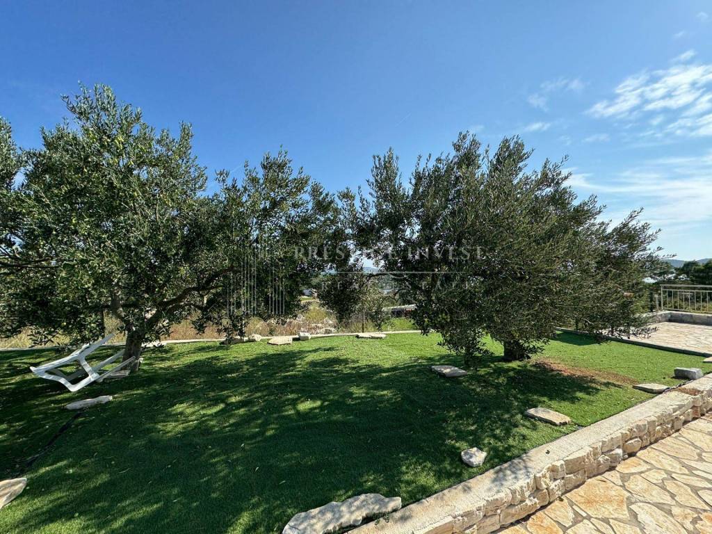 A spacious paved courtyard with an olive grove and a swimming pool is ideal for relaxing and socializing, and offers a wonderful view of the sea and islands.