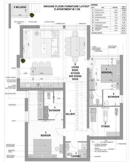 Smart home system: includes variable lighting (smoke, color, daylight), automatic blinds (open in the morning, close in the evening), heating and cooling in the rooms, an alarm system with sensors on all windows and doors, presence and movement sensors in all rooms, and a sound system in each room.