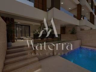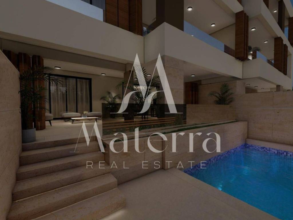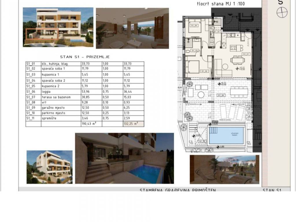 Apartment S1 – Details: Area: 132.25 m² Orientation: Southwest Layout: Entrance hall, two bedrooms, two bathrooms, kitchen with dining area and living room, opening onto a loggia of 54 m². Exterior: The loggia leads to a spacious terrace (30.85 m²) with a pool and green area (9.28 m²).