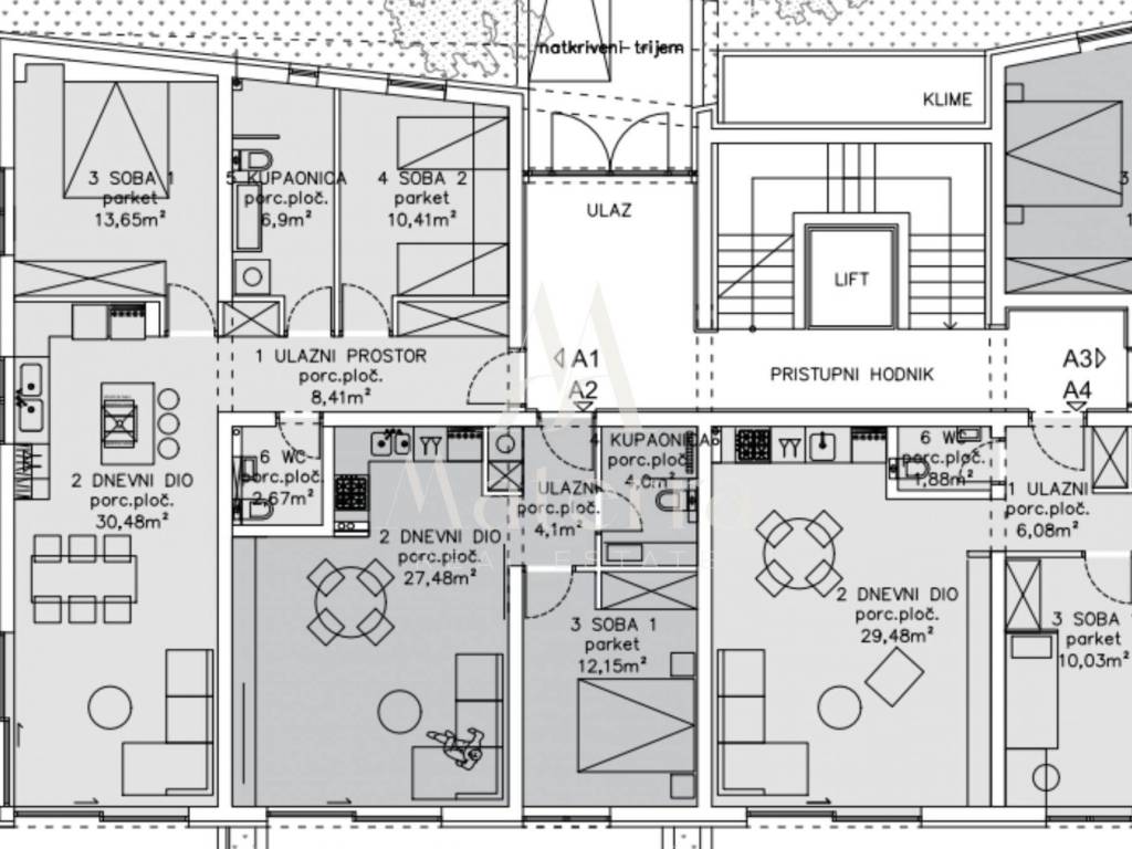 Apartment A1 is located on the ground floor of a modern residential building, featuring a functional layout and generous outdoor spaces. The net usable area is 95.67 m².