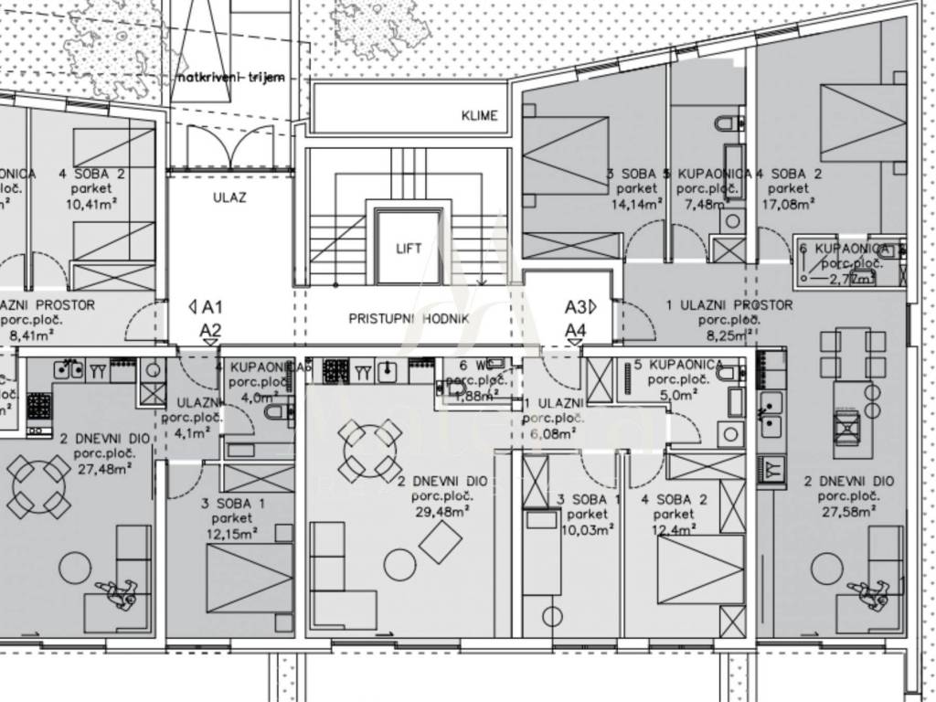 Apartment A3 is located on the ground floor of a modern residential building and stands out for its functional layout and spacious outdoor areas. The net usable area is 93 m².