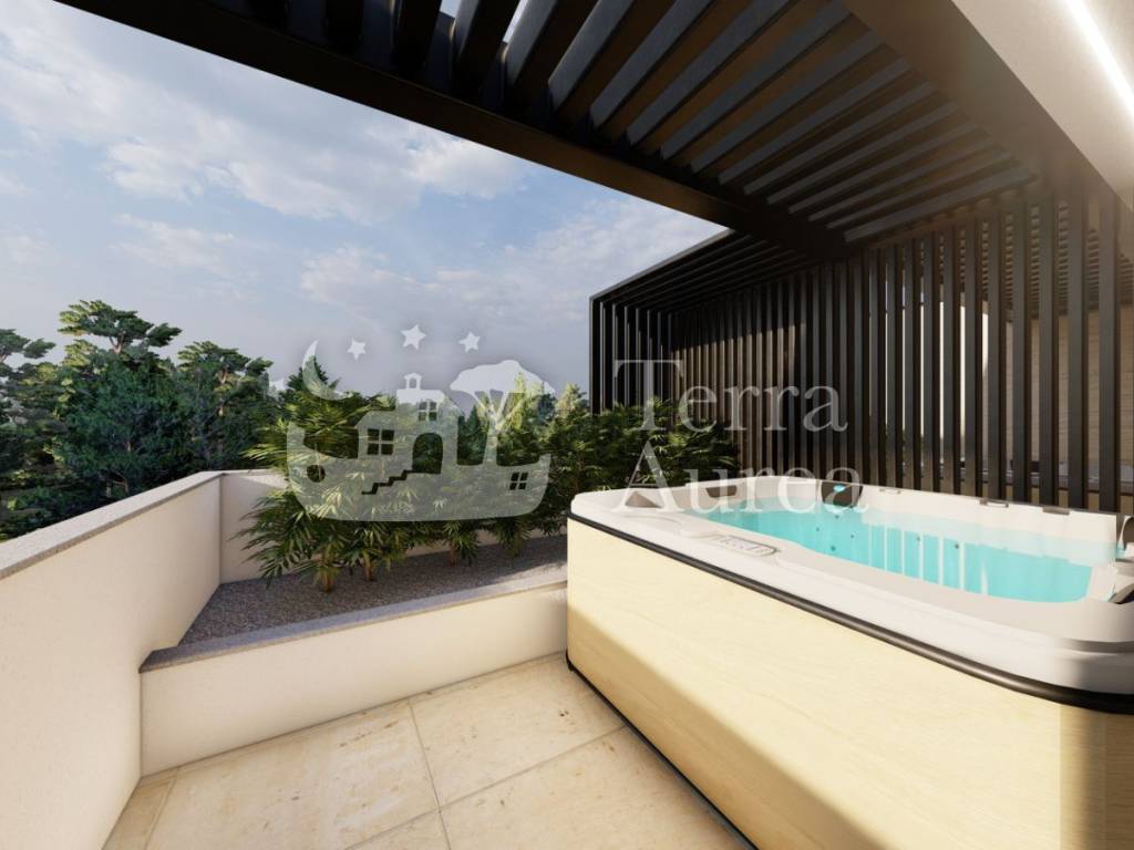 In vendita è un appartamento di lusso situato in un'ottima posizione nella città di Krk. Krk è una città dal ricco patrimonio culturale e storico e, grazie alla sua posizione, è un ottimo punto di partenza per visitare le numerose attrazioni dell'isola di Krk. Questo moderno appartamento copre una superficie abitabile di 89 m2 e si estende su tre piani. Al piano terra si trova un ingresso, un soggiorno con cucina e sala da pranzo, un servizio igienico, una scala e un terrazzo con accesso al giardino dove si può godere l'aria fresca tutti i giorni. Il primo piano comprende due moderne camere da letto, un disimpegno, un bagno e un balcone, mentre al secondo piano c'è un soppalco con bagno e l'uscita su una terrazza molto bella dove c'è una vasca idromassaggio, che è anche un'oasi di relax questa proprietà. L'appartamento sarà dotato di mobili di alta qualità, ceramiche e sanitari di alta qualità e falegnameria. Verrà realizzato il riscaldamento a pavimento e sarà realizzato anche un impianto di riscaldamento e raffrescamento tramite impianto a fancoil. E' previsto un posto auto in autorimessa, dove saranno predisposte anche le colonnine per la ricarica delle auto elettriche, e un posto auto nel parcheggio esterno. Una proprietà mozzafiato posizionata in un'ottima posizione, a 300 m dal mare e da altre strutture, sarà decorata secondo standard elevati!