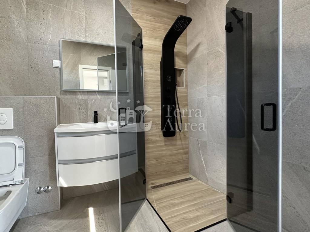 Gli infissi in PVC con tripli vetri offrono un isolamento eccezionale, garantendo temperatura ottimale ed efficienza energetica, mentre i sollevatori elettrici delle tapparelle aggiungono praticità ed eleganza. I rivestimenti dei pavimenti in ceramica e i sanitari di prima scelta aggiungono raffinatezza allo spazio, evidenziandone l'estetica e la funzionalità.