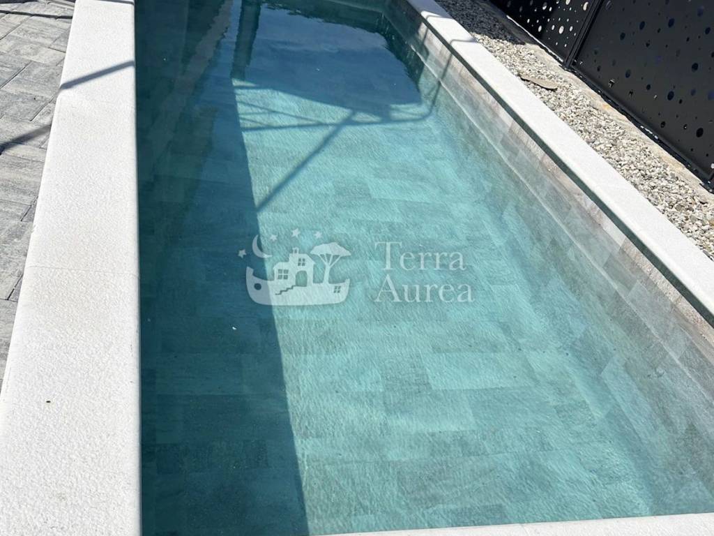 Al piano terra di questa elegante abitazione si trova un disimpegno che conduce ad un ampio bagno e ad un ambiente open space che unisce cucina, sala da pranzo e soggiorno. Grandi porte in vetro collegano armoniosamente lo spazio interno con una terrazza coperta che offre una vista sul fresco blu della piscina, creando un luogo ideale per rilassarsi o godersi i pasti all'aperto.