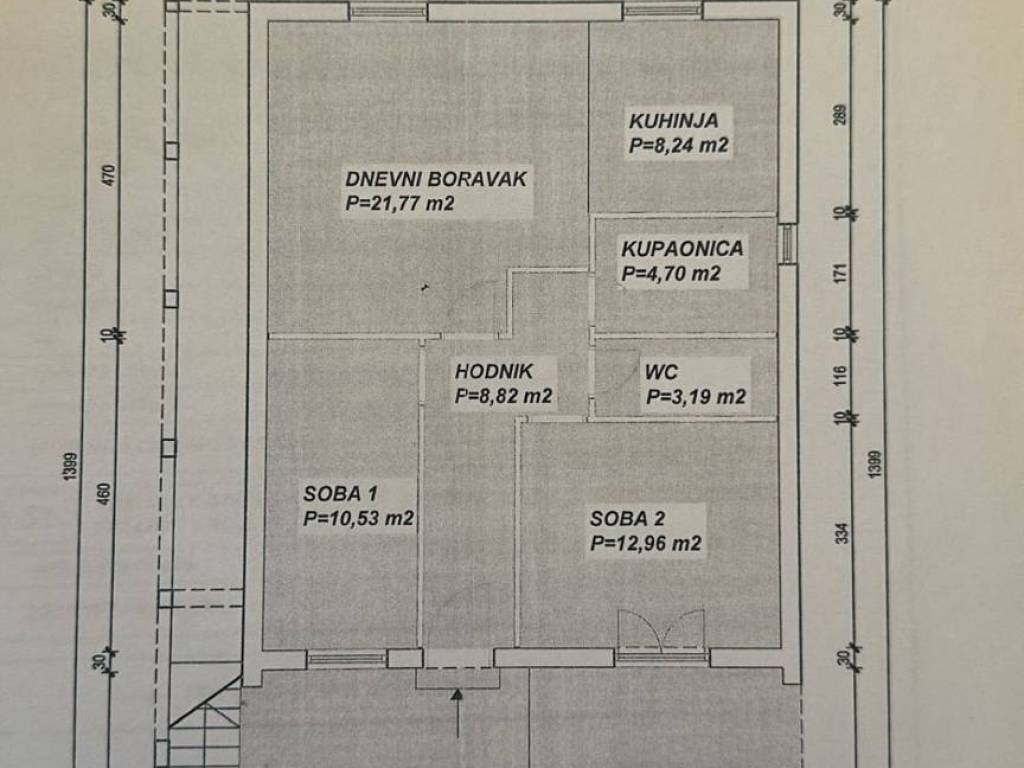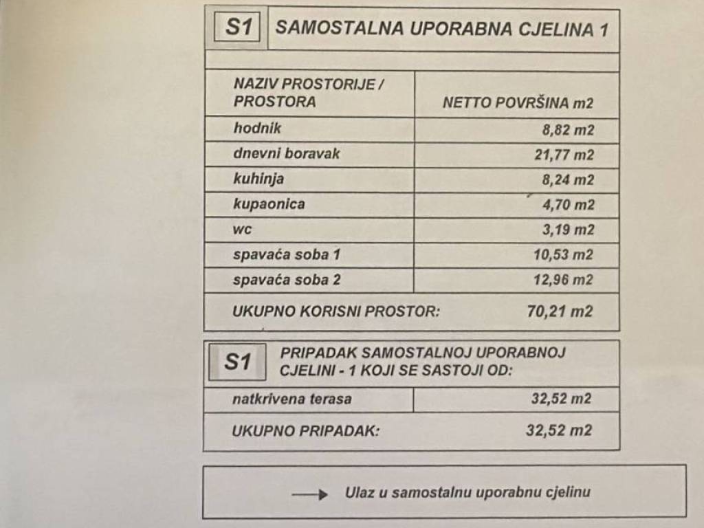 Hallway: 8.22 m² Living room: 21.77 m² Kitchen: 8.24 m² Bathroom: 4.70 m² WC: 3.19 m² Bedroom 1: 10.53 m² Bedroom 2: 12.96 m² Covered terrace: 32.52 m² – ideal for morning coffee or relaxing evenings