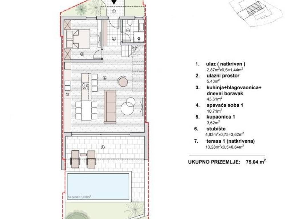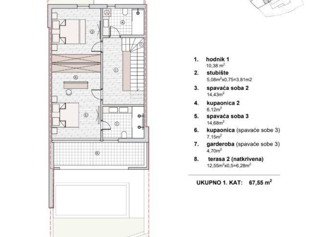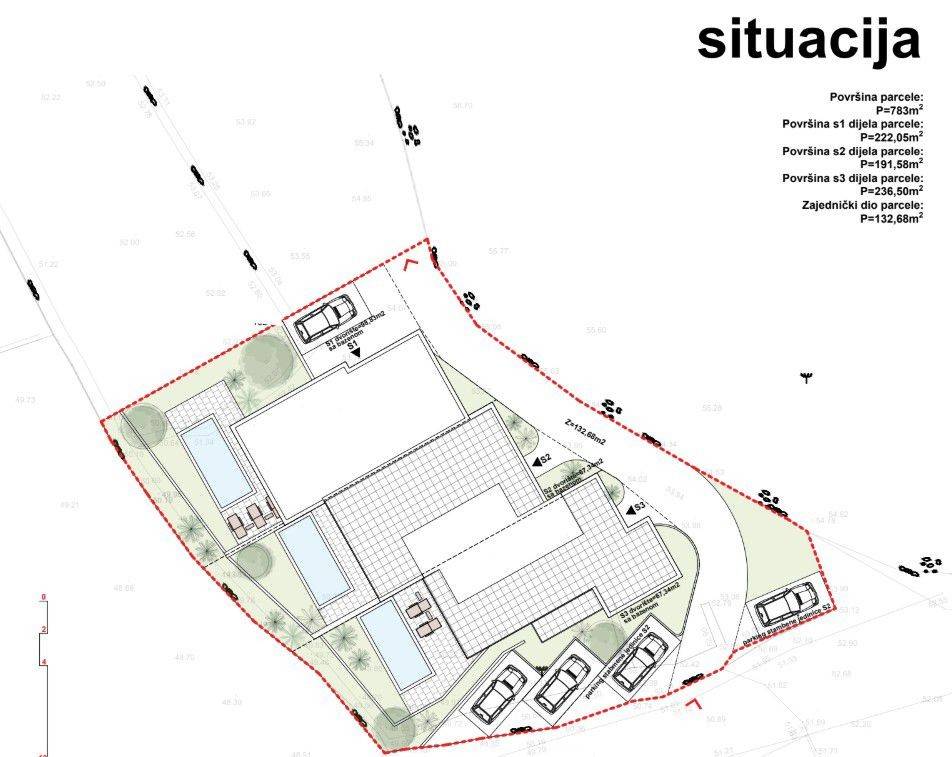 Construction of a modern residential building with three terraced units will begin in winter 2026. The property is located in a new residential area of Vodice, in a quiet location, 800 m from the beach and 1,200 m from the town center.
