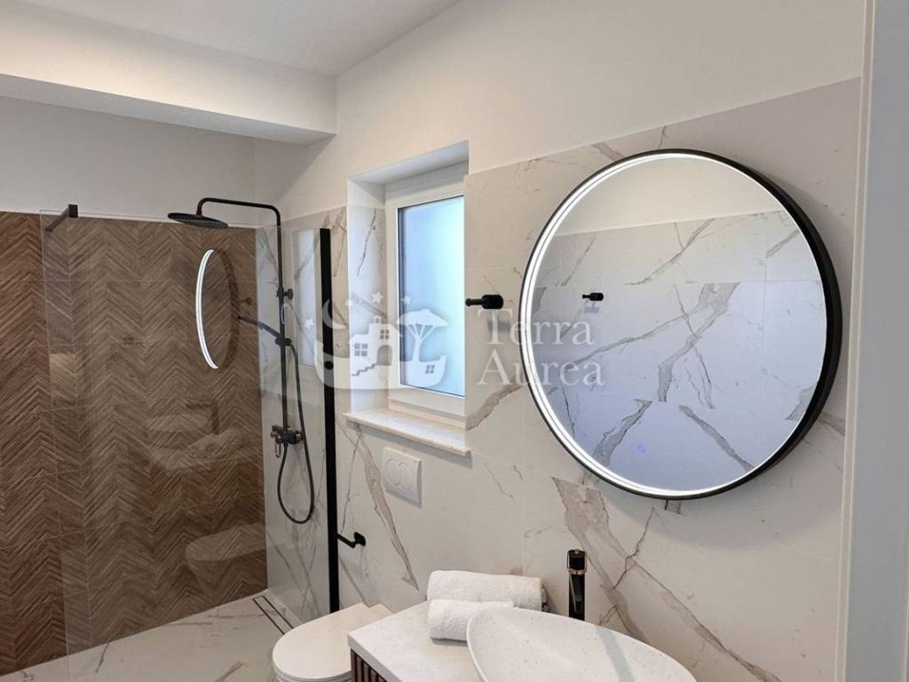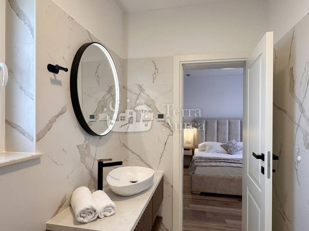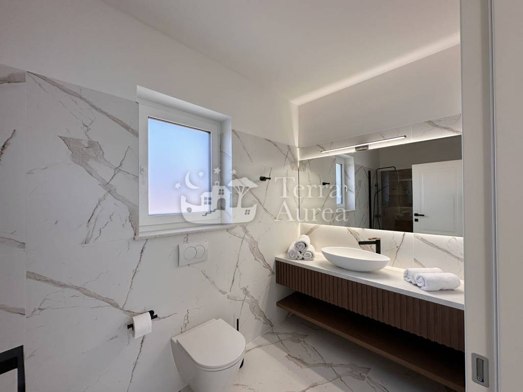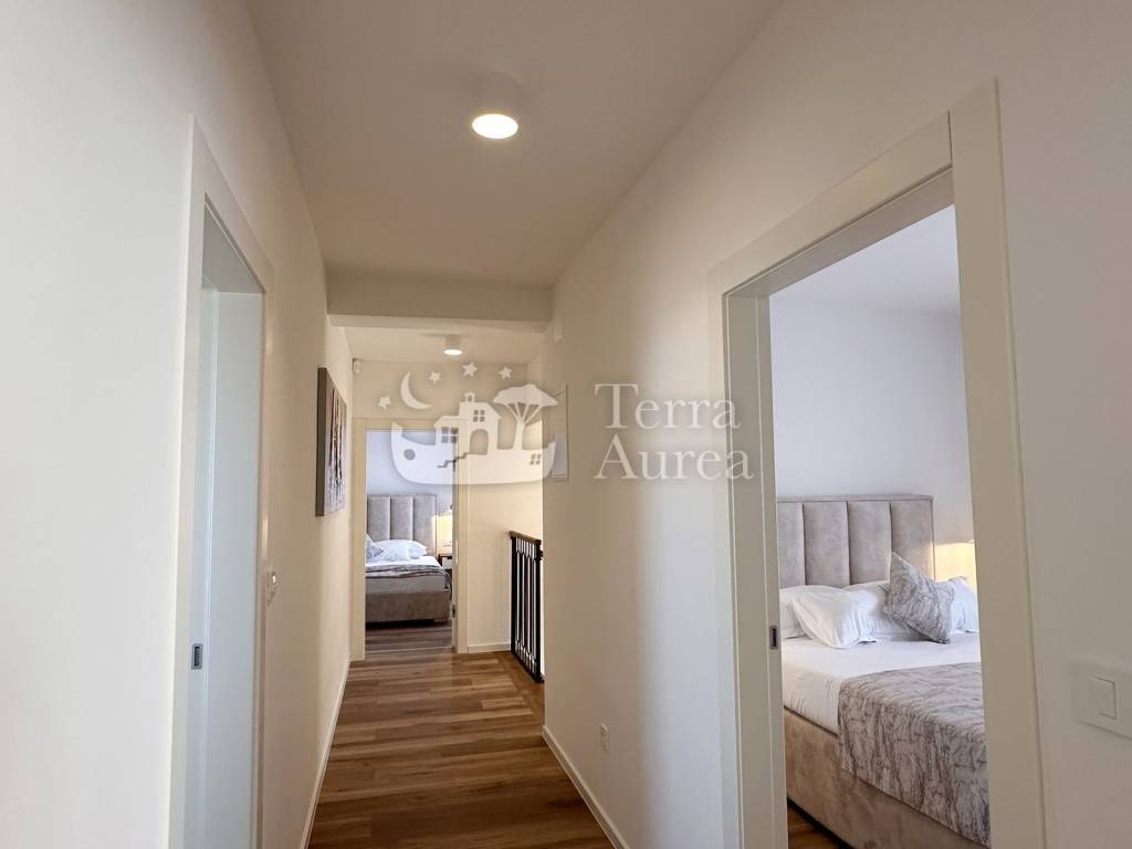 Al primo piano ci sono tre camere da letto lussuosamente arredate, ciascuna con il proprio elegante bagno e cabina doccia, garantendo il massimo comfort e privacy.