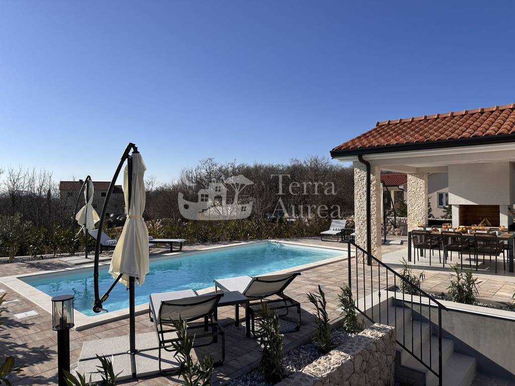 L'area esterna della villa è una vera oasi: una piscina turchese circondata da lettini prendisole e mobili da giardino offre il massimo del relax e del divertimento all'aria aperta.