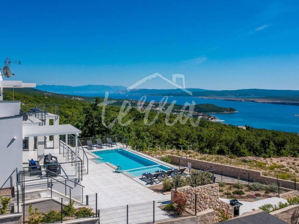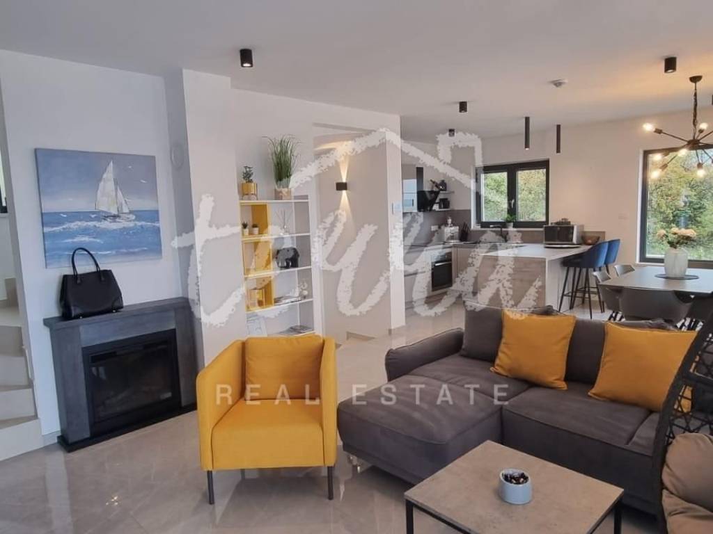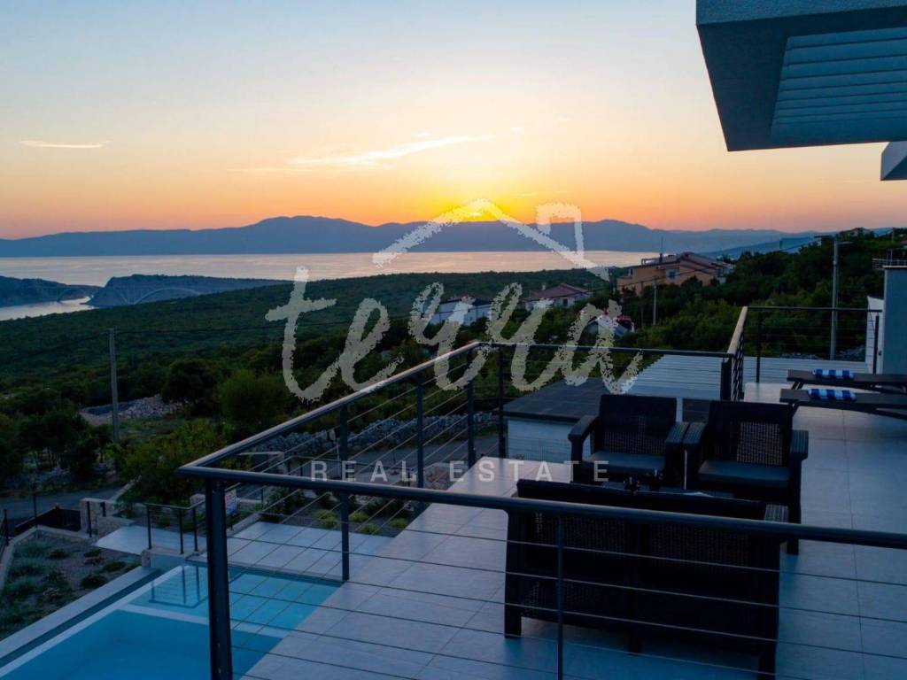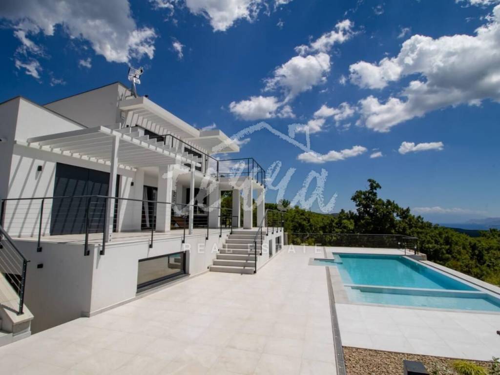 Detached family house on the edge of the green belt with a spectacular view of Kvarner. The house was built with high quality materials both in the interior and exterior. Large paved parking for several cars in front of the house. A staircase leads to the house, which is entered from the side. The ground floor has a bedroom with en suite bathroom, toilet, kitchen with dining room and living room with exit to the terrace with space for socializing. Internal staircase leads to the first floor (two bedrooms each with en suite bathroom and terrace) and basement designed space for socializing with fitness, small wellness and a whole room for technology. Behind the house is an earthen part and a paved terrace with electricity and water connections. In front of the house on a large plateau dominates the infinity pool with a small children's pool and sun deck. The house is being prepared for categorization and tourist rent. The yard is completely surrounded by a stone wall made by hand.