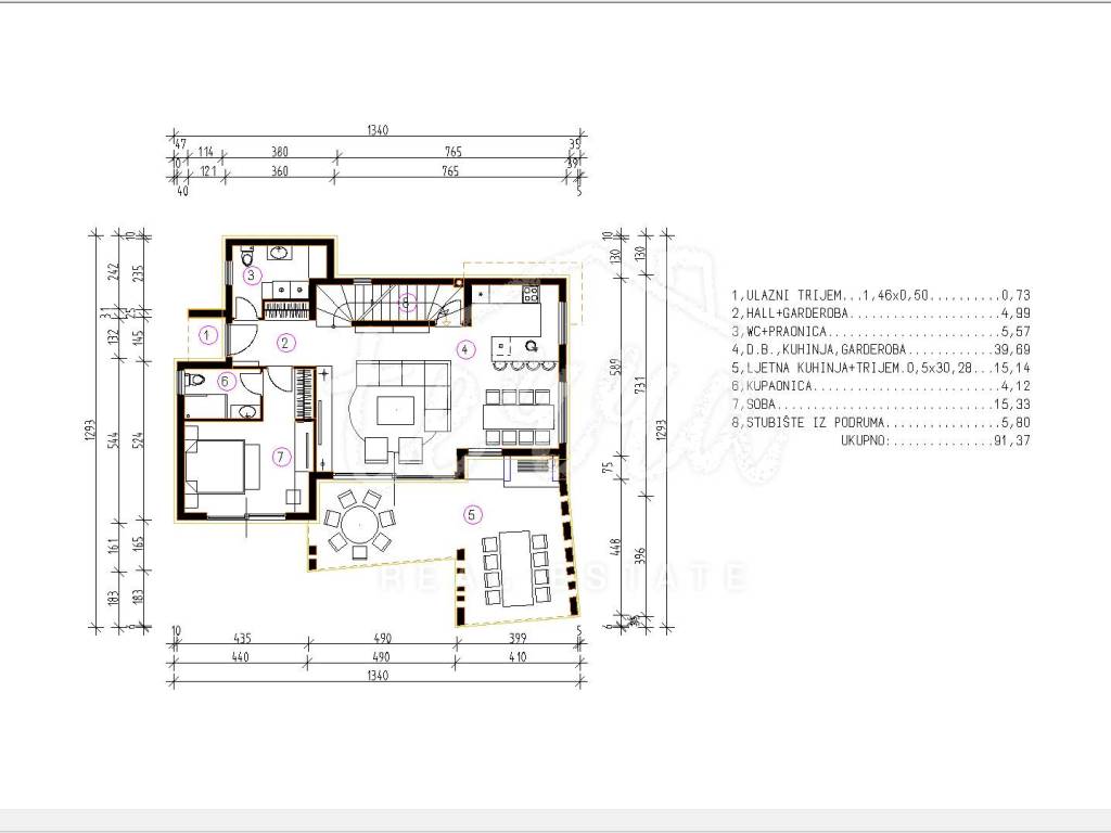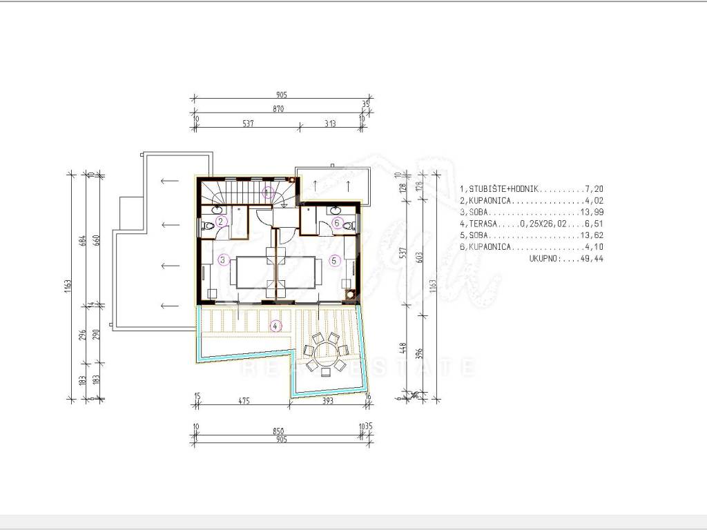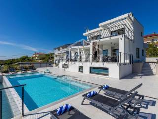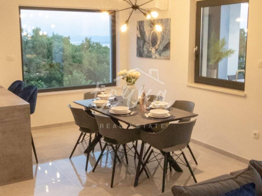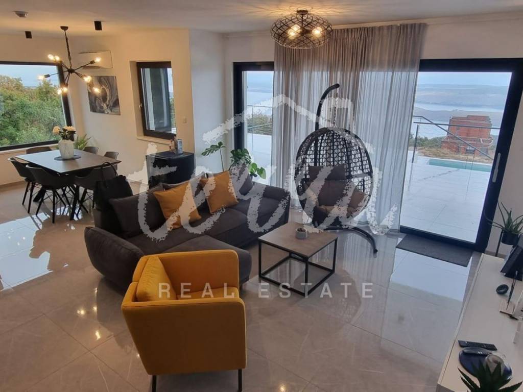 Detached family house on the edge of the green belt with a spectacular view of Kvarner. The house was built with high quality materials both in the interior and exterior. Large paved parking for several cars in front of the house. A staircase leads to the house, which is entered from the side. The ground floor has a bedroom with en suite bathroom, toilet, kitchen with dining room and living room with exit to the terrace with space for socializing. Internal staircase leads to the first floor (two bedrooms each with en suite bathroom and terrace) and basement designed space for socializing with fitness, small wellness and a whole room for technology. Behind the house is an earthen part and a paved terrace with electricity and water connections. In front of the house on a large plateau dominates the infinity pool with a small children's pool and sun deck. The house is being prepared for categorization and tourist rent. The yard is completely surrounded by a stone wall made by hand.