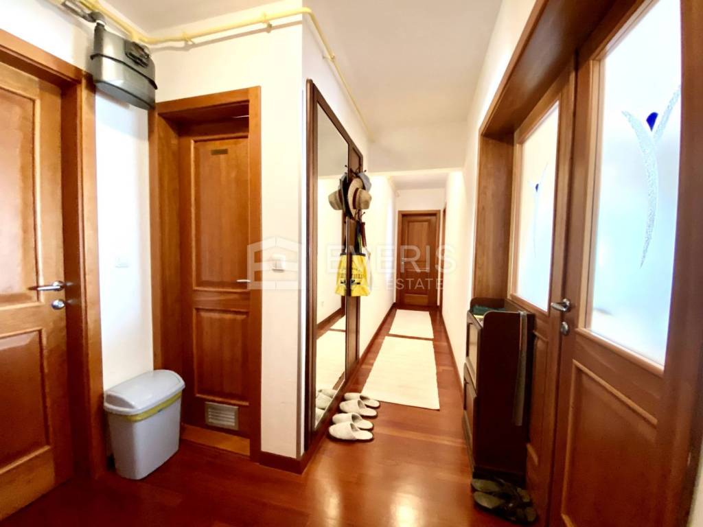 The apartment consists of: * Hallway, smaller bathroom, two bedrooms with connected larger bathroom leading to the back covered balcony, living room, dining room and kitchen in one leading to the other covered balcony which is also connected to the living room, and a separate garage space from 15 m2.