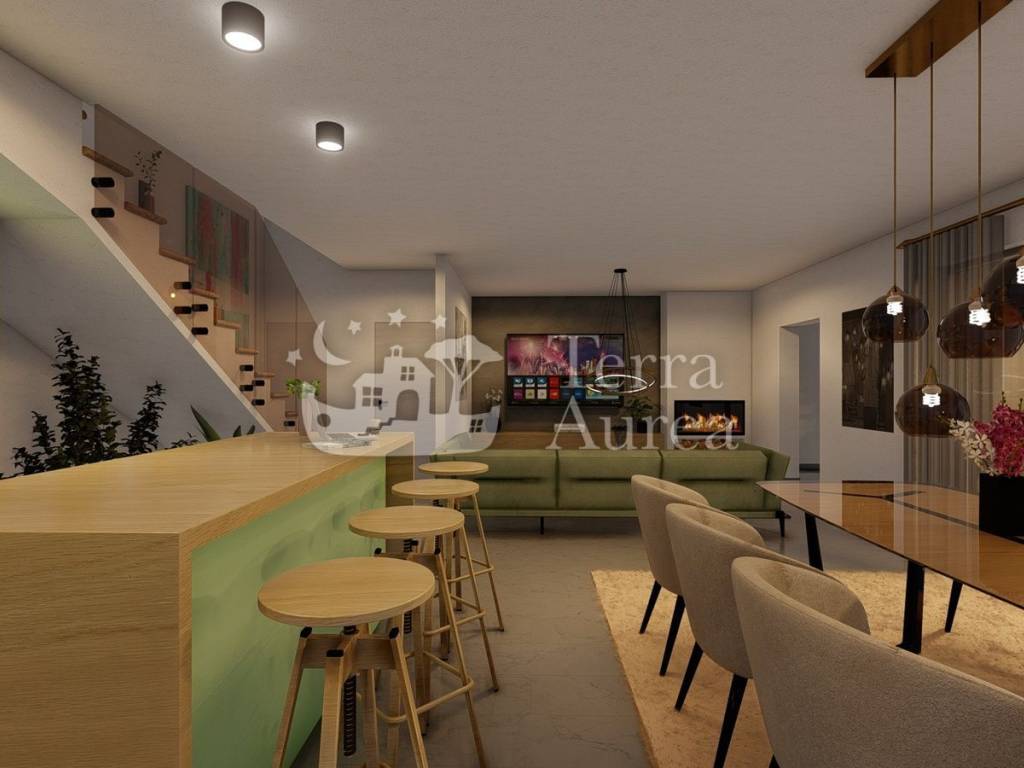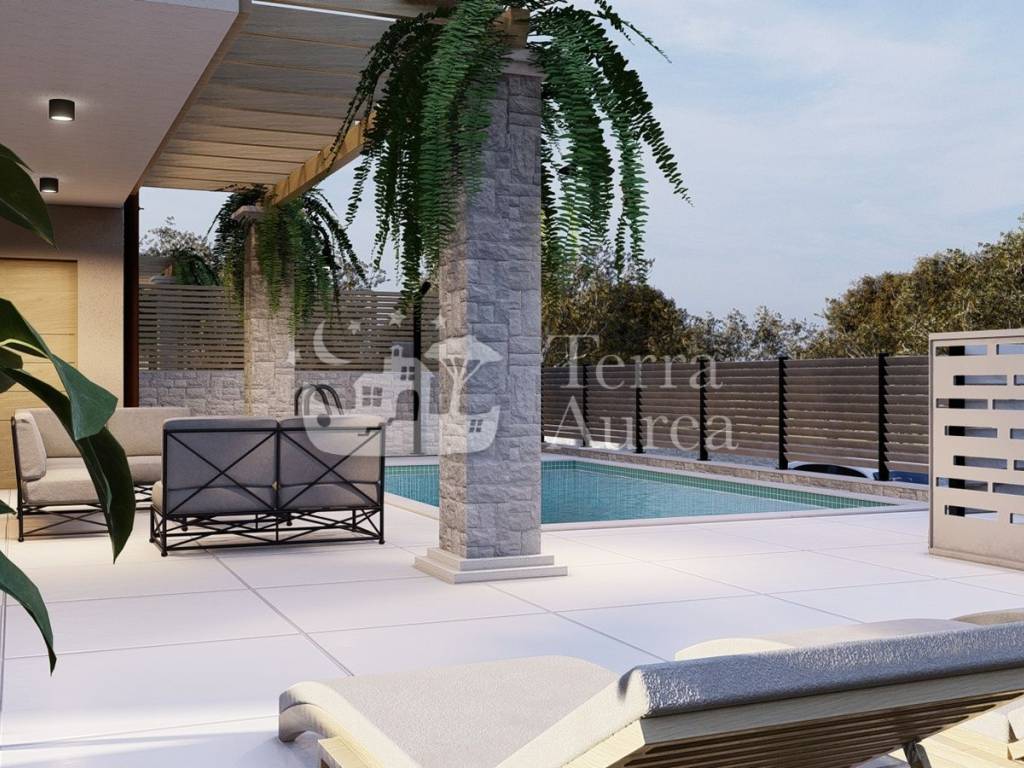 Il piano terra comprende un ampio soggiorno con accesso a una terrazza coperta con piscina e zona prendisole, una sala da pranzo, una cucina moderna e un pratico ripostiglio. Anche da questo piano si gode di una splendida vista sul mare, creando un'atmosfera piacevole per il relax e le riunioni di famiglia.