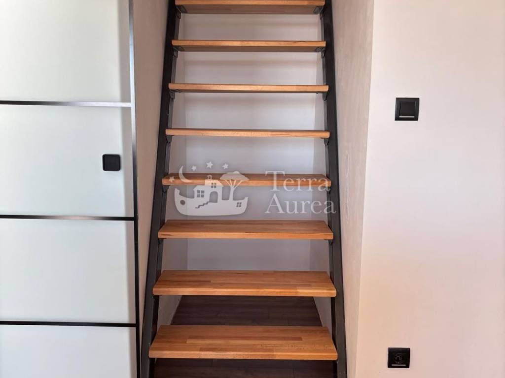 Il piano inferiore unisce soggiorno, sala da pranzo e cucina in un armonioso open space che invita alla socializzazione, mentre il soggiorno si apre su un balcone che offre ulteriore atmosfera e connessione con lo spazio esterno. Sullo stesso piano si trovano la camera da letto, la cabina armadio e un bagno splendidamente arredato.