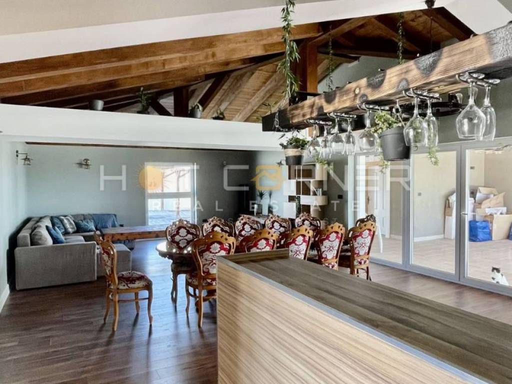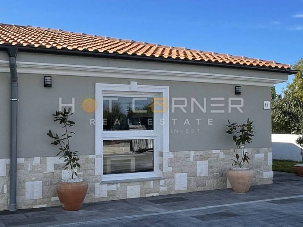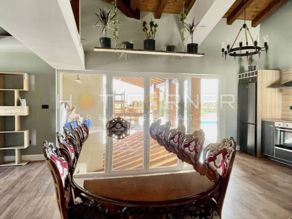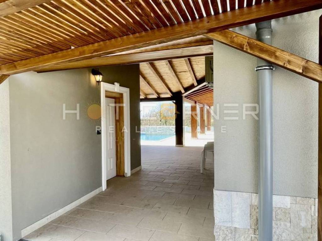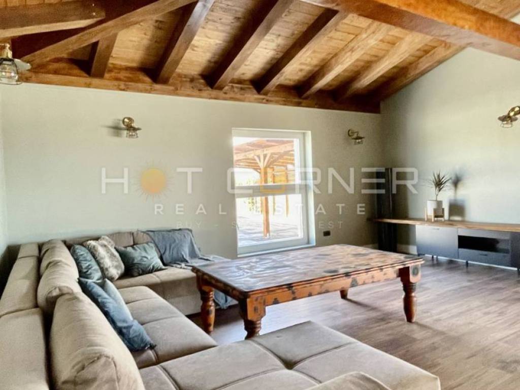 La villa è composta da un ampio soggiorno con cucina, 3 camere da letto, ciascuna con bagno separato con doccia e wc, stanza separata con ulteriore camera da letto e bagno (affittacamere) e una moderna taverna con vista sulla piscina e un ampio terrazzo coperto con travi in legno.