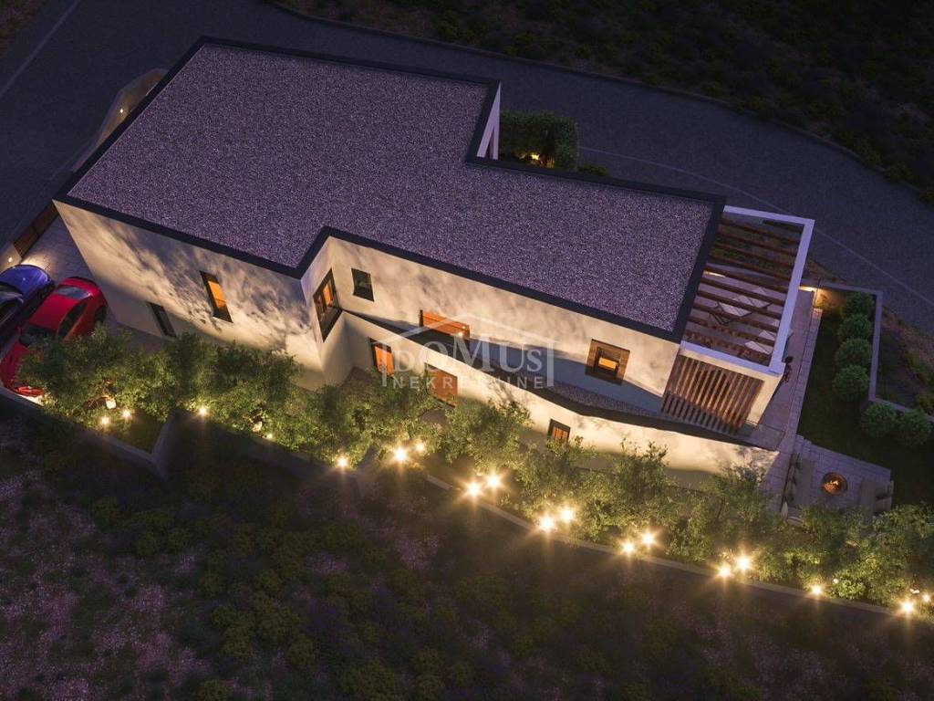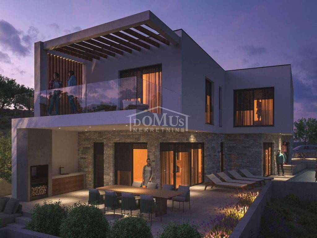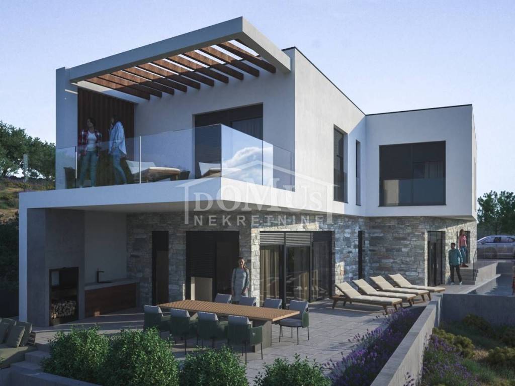 New construction, villa with modern architecture and functional layout. Detached building, on two floors with a total usable area of 257.45 m2 on a plot of 571 m2. The ground floor consists of an entrance area, a wellness area, a garage with an engine room, a kitchen with a dining room, a living room with access to the terrace and a summer kitchen. From the terrace there is a separate entrance to a small toilet. Internal stairs lead to the 1st floor, which consists of a hallway, four bedrooms each with their own bathroom and wardrobe, and one bedroom has access to a large and spacious terrace of 22.60 m2. The villa will be equipped with high quality ceramic materials and sanitary ware, air conditioning, a heat pump for underfloor heating throughout the building, solar panels for water, and a charging station for electric cars in the garage, electric roller blinds. The distance to the beach is 800 m, and to the town center 1,100 m.