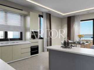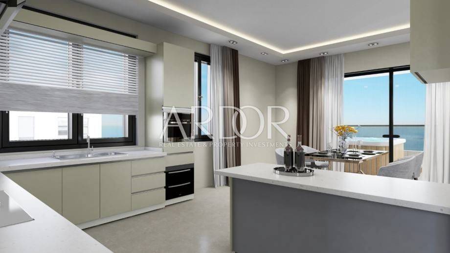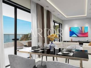 Isola di Arbe, Banjol – in vendita un esclusivo attico al secondo piano di un edificio moderno, di 134 m², con un’ampia terrazza attrezzata con jacuzzi, barbecue e zona lounge, in parte coperta e in parte aperta, con vista panoramica sul mare, sulle isole di Pag e Cherso e sulla città di Arbe.
