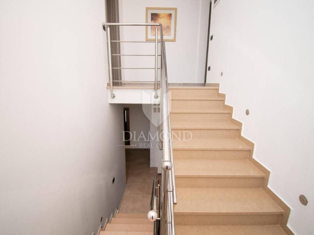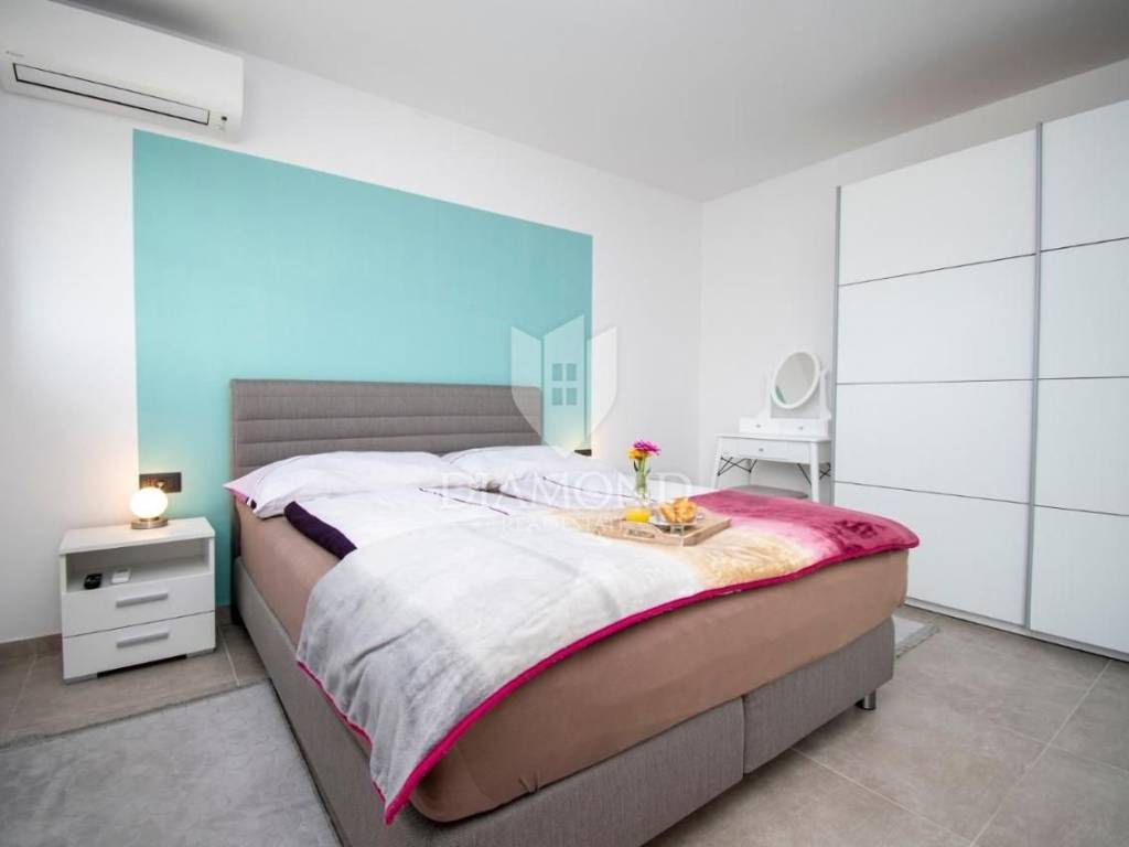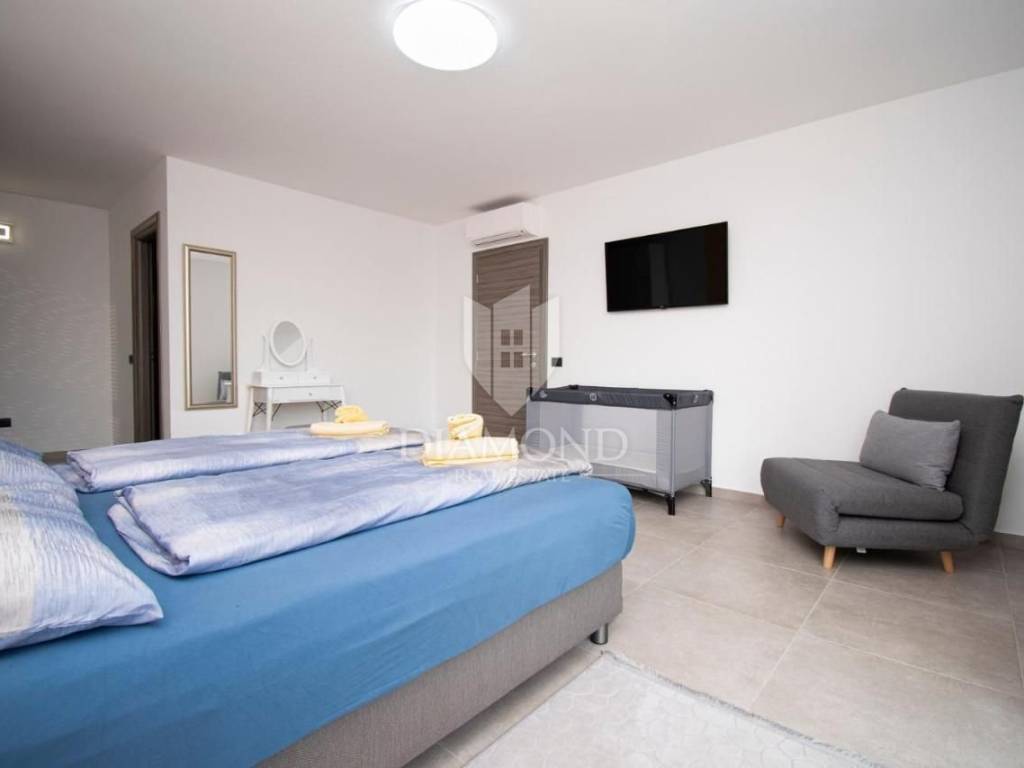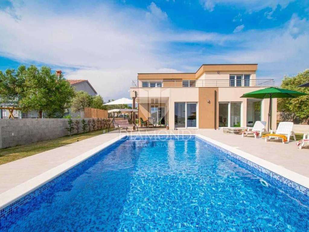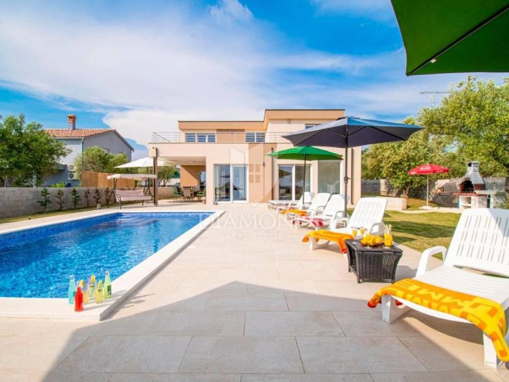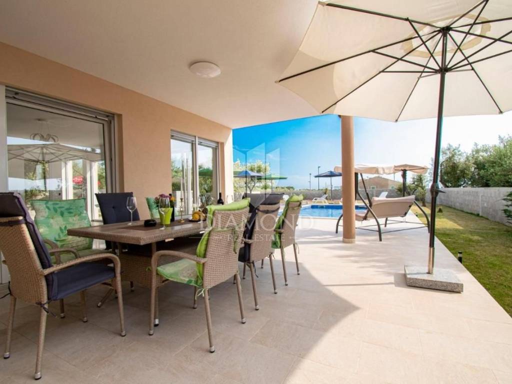 Questa nuova e moderna casa si estende per circa 270 mq ed è composta da un ingresso che conduce ad uno spazio aperto dove si trova un soggiorno, cucina e sala da pranzo con accesso ad una terrazza coperta e una piscina con solarium. Sempre al piano terra c'è un'altra camera da letto con la propria loggia e bagno e un ripostiglio. Parte della pianta del piano terra comprende due ripostigli con ingresso dall'esterno della casa. Nell'ingresso è presente anche una scala che porta al piano superiore della casa, dove si trovano altre tre camere da letto con bagno e terrazzi privati, di cui due vista mare. L'ampio giardino offre spazio sufficiente per quattro posti auto e per varie attività all'aria aperta.