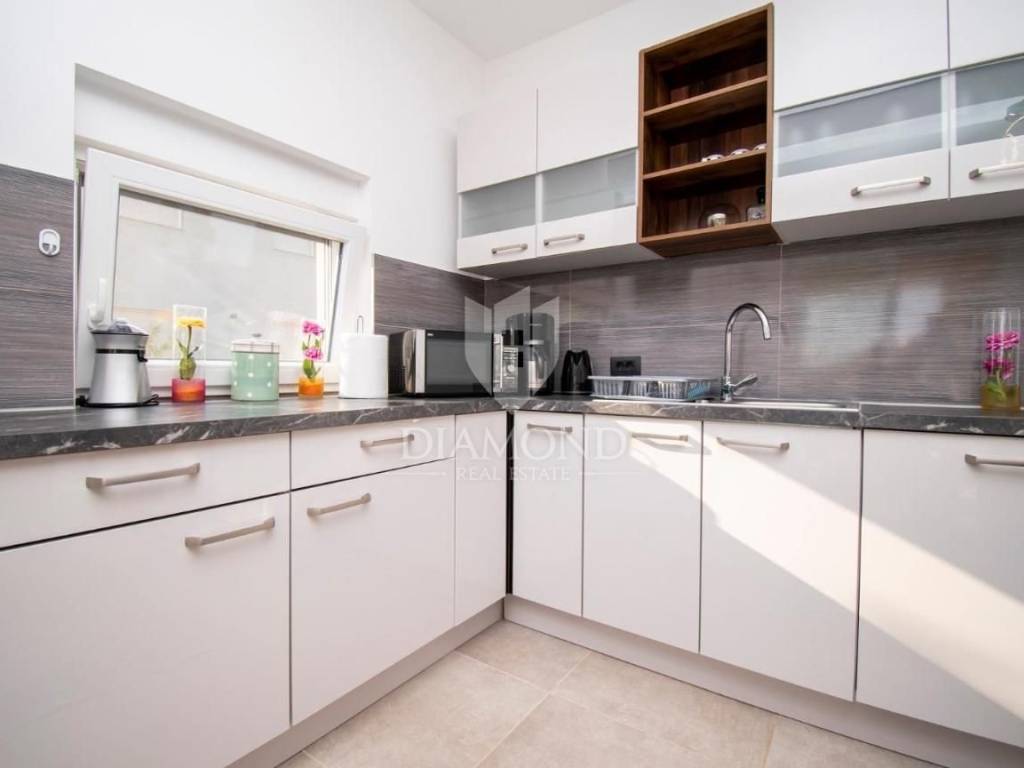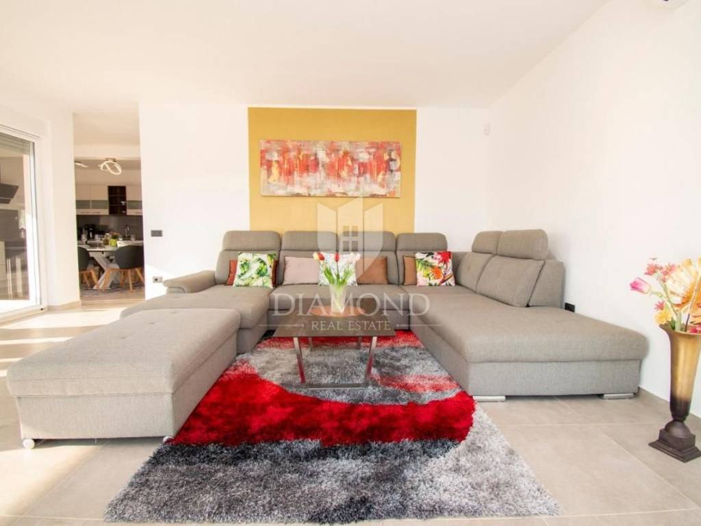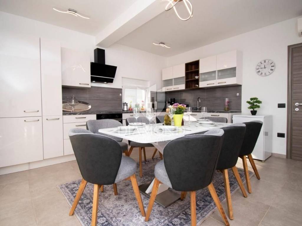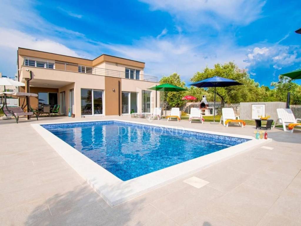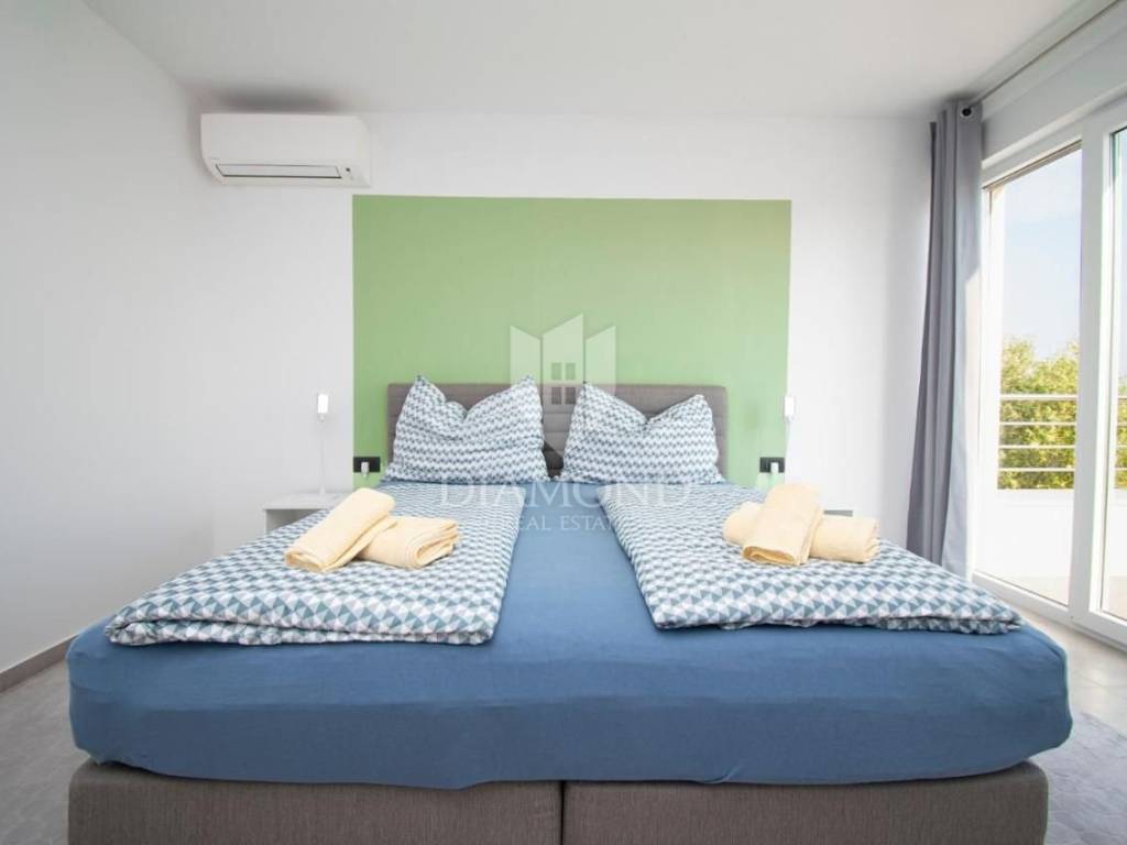 Questa nuova e moderna casa si estende per circa 270 mq ed è composta da un ingresso che conduce ad uno spazio aperto dove si trova un soggiorno, cucina e sala da pranzo con accesso ad una terrazza coperta e una piscina con solarium. Sempre al piano terra c'è un'altra camera da letto con la propria loggia e bagno e un ripostiglio. Parte della pianta del piano terra comprende due ripostigli con ingresso dall'esterno della casa. Nell'ingresso è presente anche una scala che porta al piano superiore della casa, dove si trovano altre tre camere da letto con bagno e terrazzi privati, di cui due vista mare. L'ampio giardino offre spazio sufficiente per quattro posti auto e per varie attività all'aria aperta.
