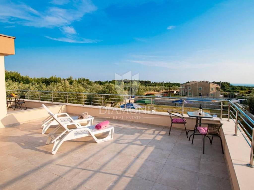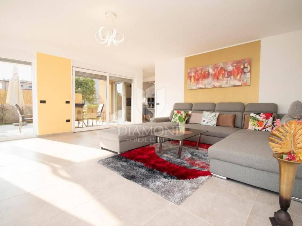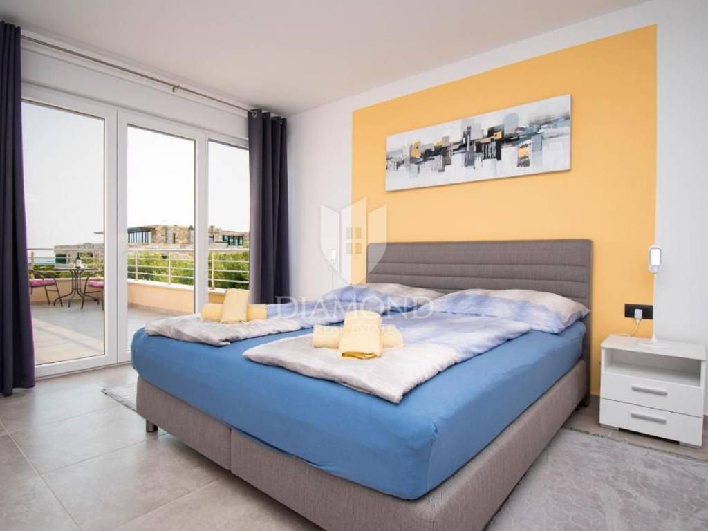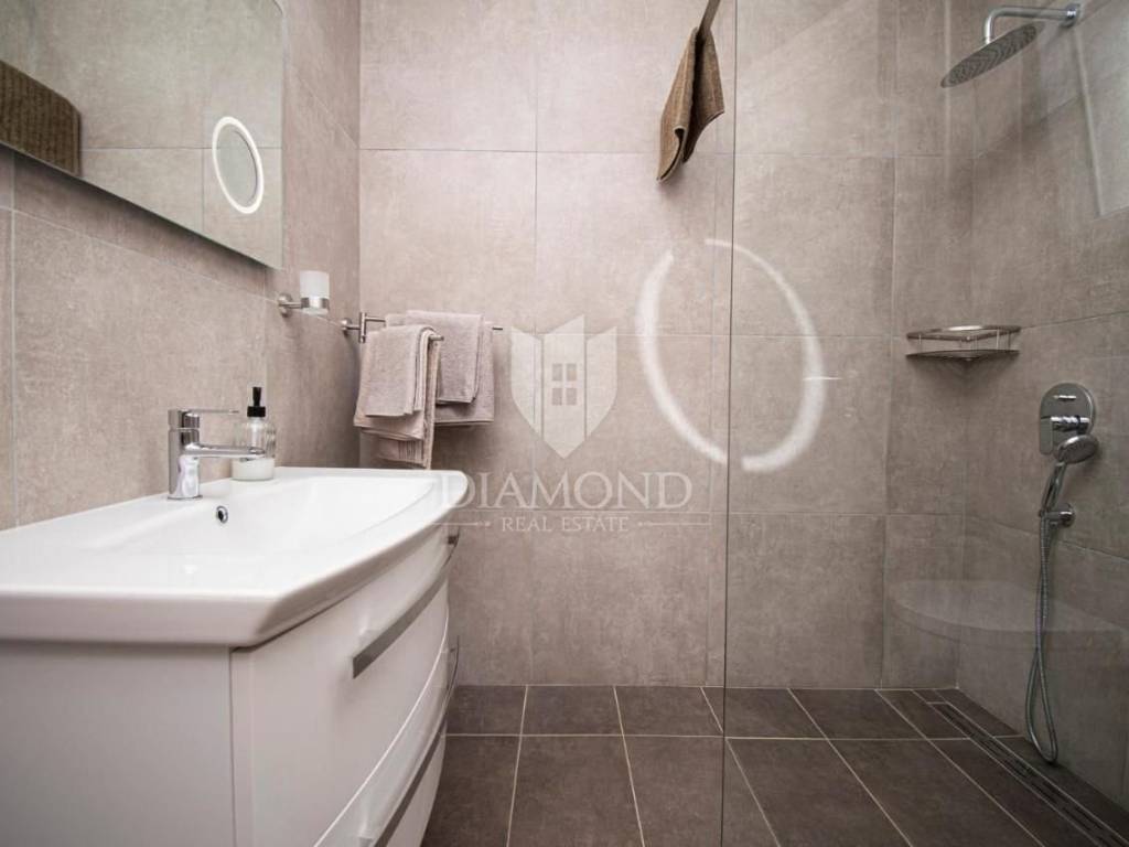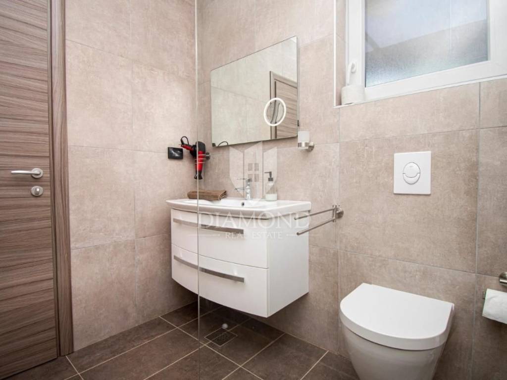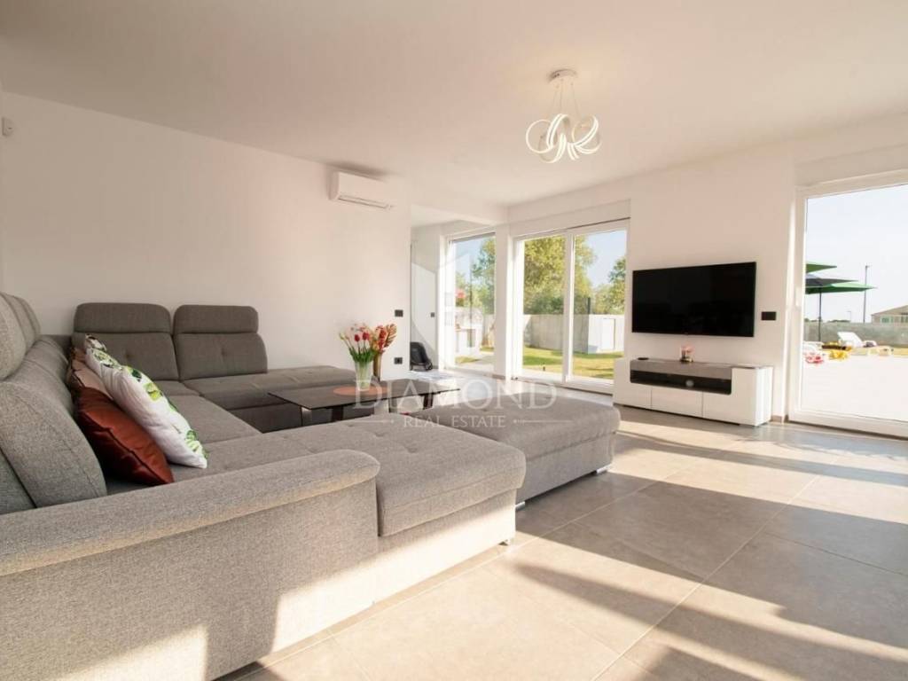 Questa nuova e moderna casa si estende per circa 270 mq ed è composta da un ingresso che conduce ad uno spazio aperto dove si trova un soggiorno, cucina e sala da pranzo con accesso ad una terrazza coperta e una piscina con solarium. Sempre al piano terra c'è un'altra camera da letto con la propria loggia e bagno e un ripostiglio. Parte della pianta del piano terra comprende due ripostigli con ingresso dall'esterno della casa. Nell'ingresso è presente anche una scala che porta al piano superiore della casa, dove si trovano altre tre camere da letto con bagno e terrazzi privati, di cui due vista mare. L'ampio giardino offre spazio sufficiente per quattro posti auto e per varie attività all'aria aperta.