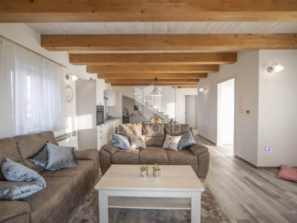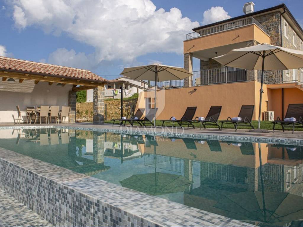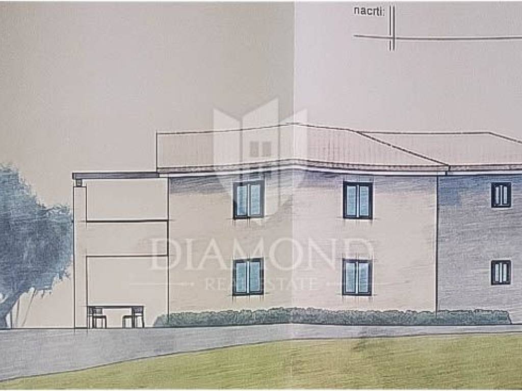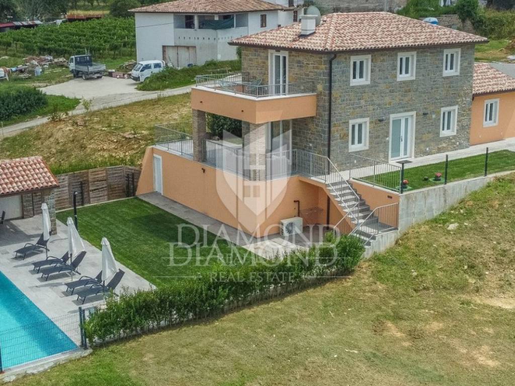 In veindit questa bellissima villa con piscina in costruzione! La villa si estende su piano terra e primo piano e la superficie della villa è di 165 mq. Al piano terra si trovano il soggiorno, la cucina con sala da pranzo, un disimpegno, un wc, un ripostiglio e 1 camera da letto con il proprio bagno. Dal soggiorno e dalla cucina si accede ad un terrazzo ideale per socializzare e divertirsi. Le scale interne conducono al piano dove si trovano un disimpegno, un ripostiglio e 3 camere da letto, ognuna delle quali ha il proprio bagno. Le camere hanno accesso ad una terrazza con una bellissima e aperta vista sull'incantevole paesaggio istriano. La villa è riscaldata tramite riscaldamento a pavimento con pompe di calore e aria condizionata. Il cortile è spazioso, di oltre 300 m2, e all'interno del cortile c'è una piscina riscaldata con solarium e una cucina estiva. Accanto alla villa c'è spazio per diversi posti auto.