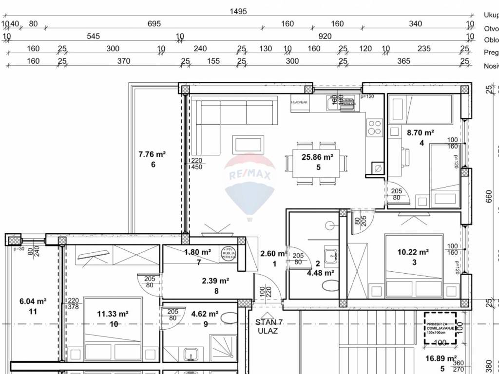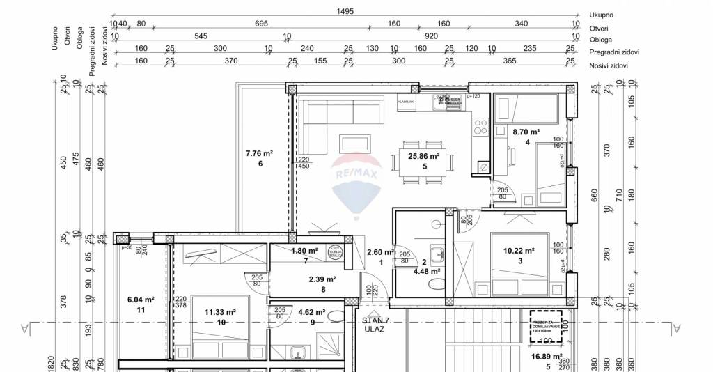 The apartment has an area of ​​80 m2 and consists of an entrance hall of 2.6 m2, living room, kitchen and dining area of ​​25.86 m2, bathroom no. 1. 4.48 m2, bedroom no. 1 10.22 m2, bedroom no. 2 8.7 m2, bedroom no. 3 11.33 m2, corridor 2.39 m2, pantry 1.8 m2, loggia 6, 04 m2, bathroom no. 2. 4.62 m2 and covered balcony 7.76 m2.