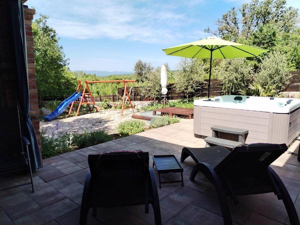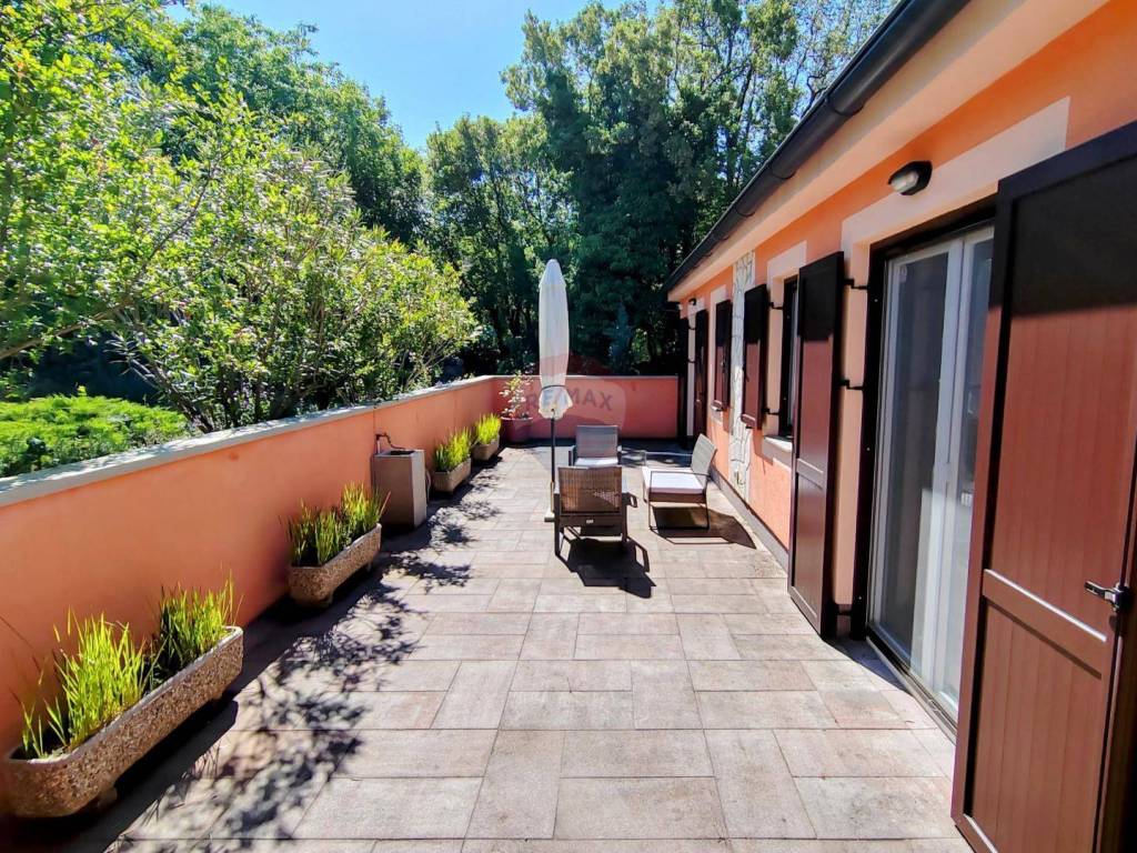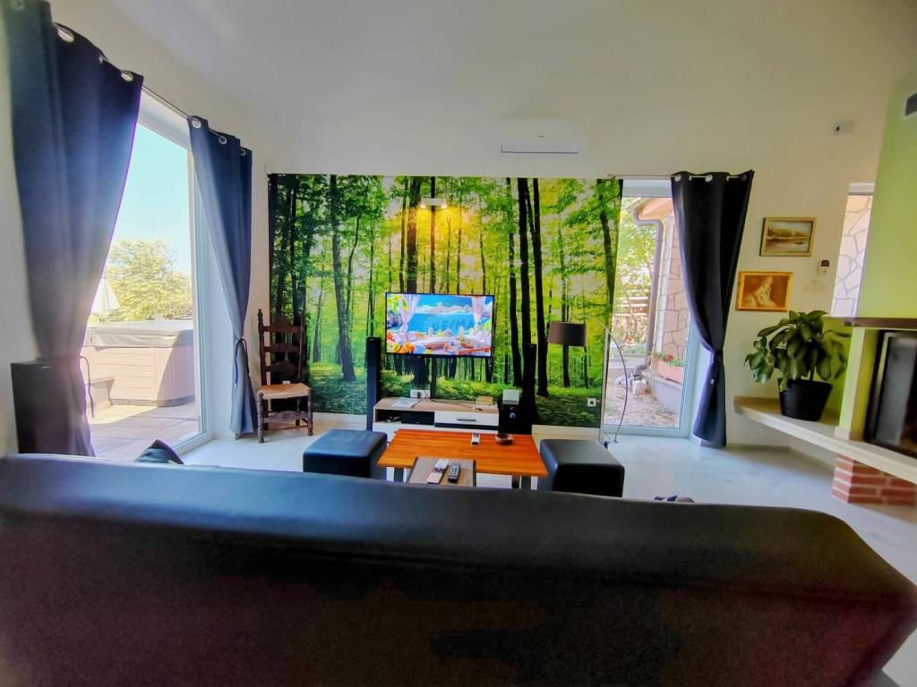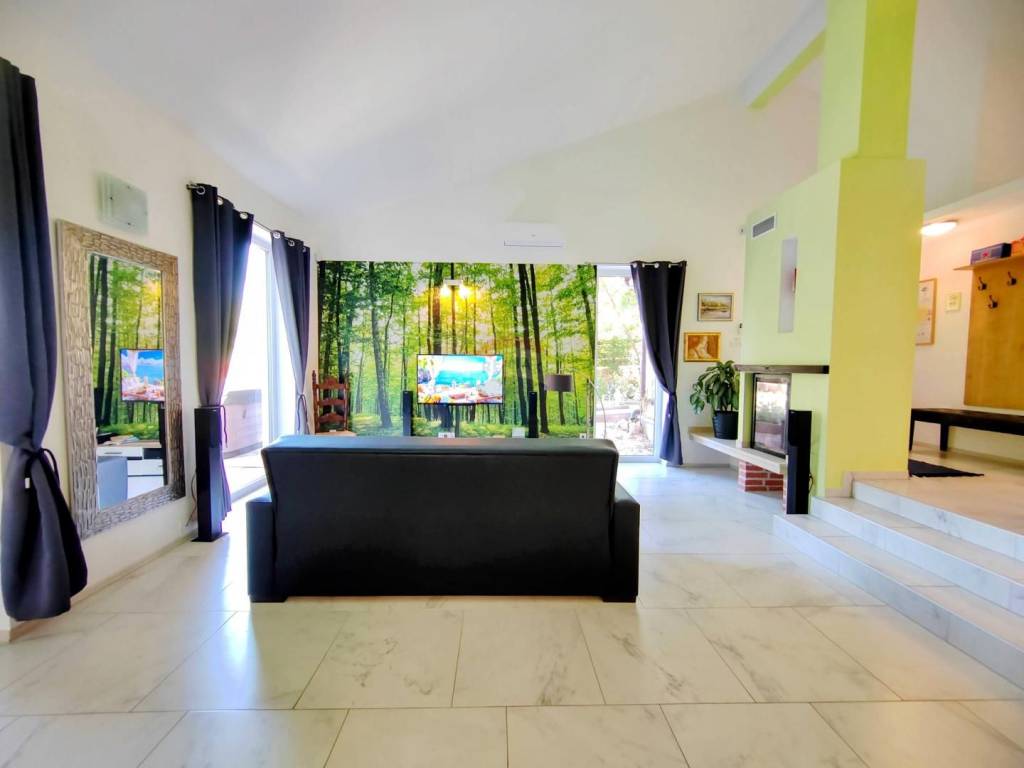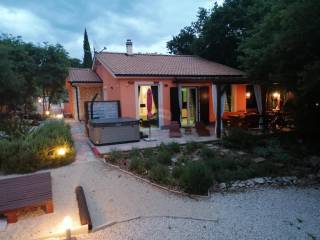 Dal soggiorno si accede a una terrazza coperta con zona barbecue, affacciata su un giardino curato e una vasca idromassaggio, perfettamente integrata nella natura circostante. Sul retro della casa si trova un’ulteriore terrazza scoperta, ideale per godere della quiete all’ombra del verde.
