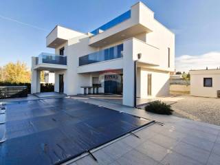 La casa è stata costruita nel 2023 su un terreno di 484 m2 e dispone di una superficie abitabile totale di 190 m2, distribuita tra piano terra e primo piano. L’area esterna della casa è composta da un cortile pavimentato attorno alla piscina, da una zona rialzata adibita a parcheggio e da un’area verde, per una superficie totale di 300 m². Nella parte anteriore della casa si trovano una grande piscina riscaldata di 8 x 4 m, una terrazza coperta che collega il piano terra con l’area esterna della villa, un locale tecnico per la piscina e uno spazio aggiuntivo previsto come ripostiglio esterno. Davanti alla casa si estendono terreni agricoli, garantendo così una vista non edificabile.