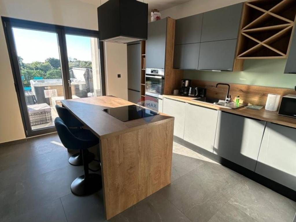 La zona giorno al piano terra è concepita come open space; la cucina con isola è elegantemente separata dalla zona piscina e solarium. Al piano terra sono inoltre presenti un bagno e un toilette per ospiti.