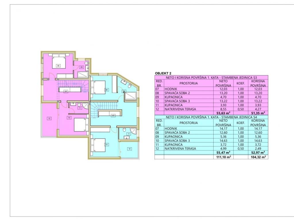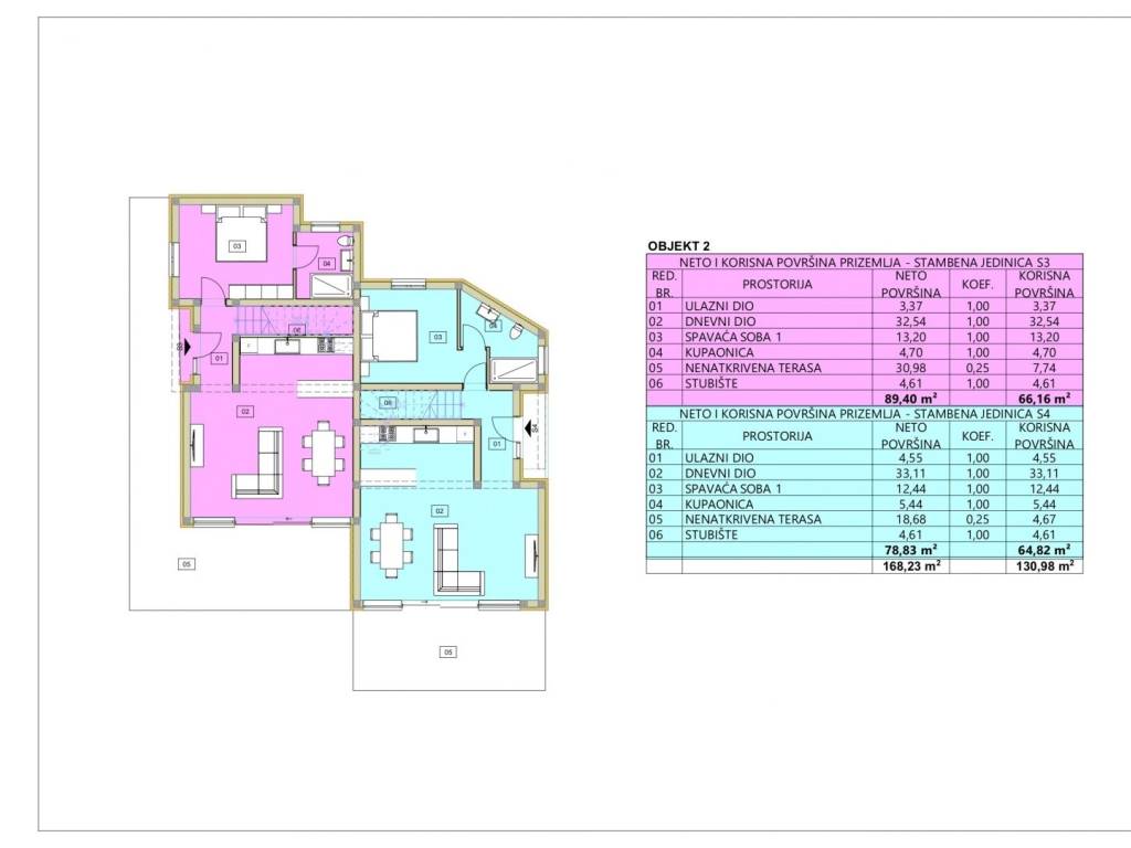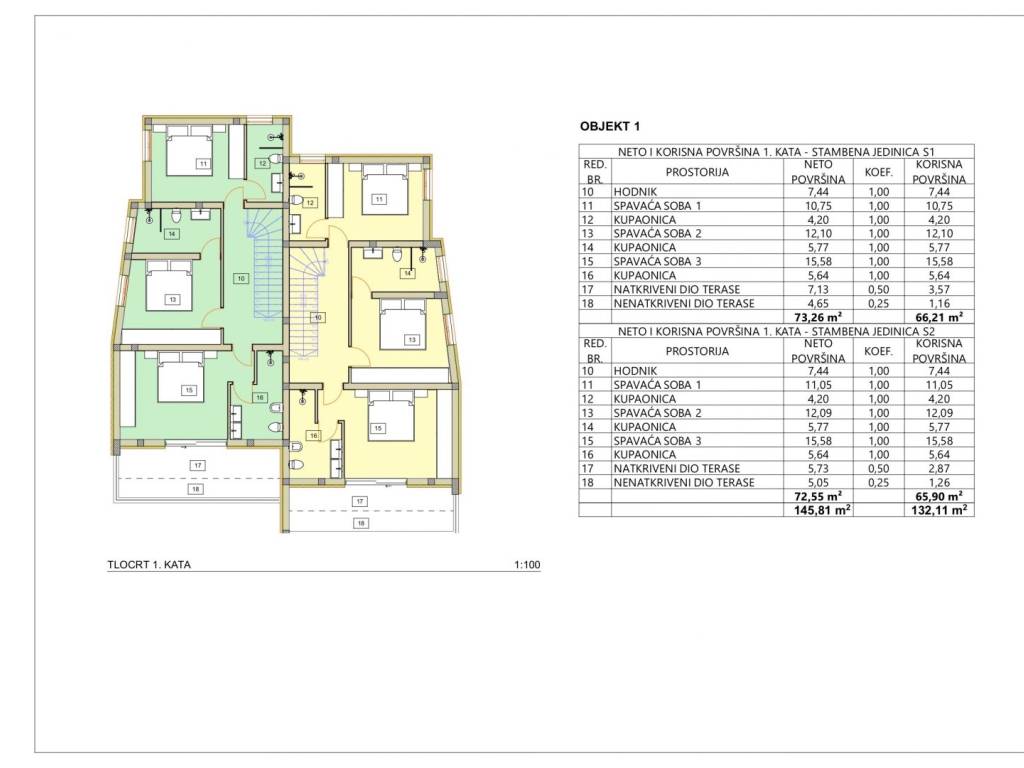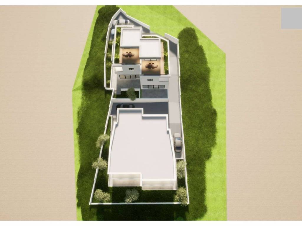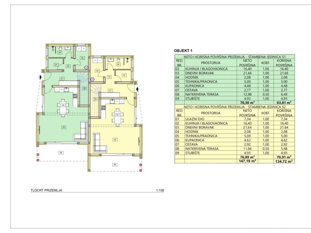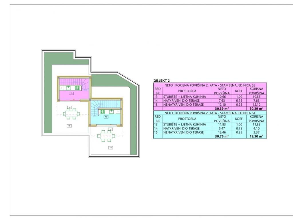 Building 1 consists of a ground floor and one floor. The total area of the two residential units in building 1 is 293.00 m2. Building 2 consists of a ground floor and two floors. The total area of two residential units in building 2 is 310.00 m2. Each building has its own garden, garden and parking spaces.