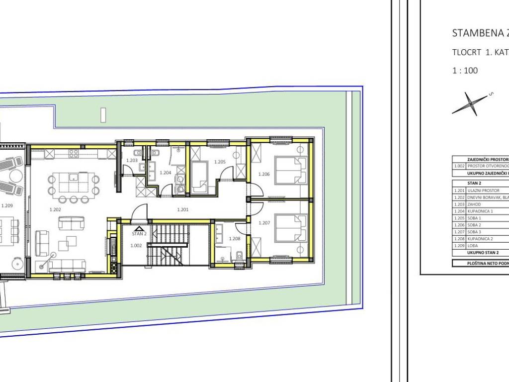1st floor - Apartment on the first floor of the building with a total net usable area of ​​124.00 m2 (net usable area with 2 parking spaces) and consists of an entrance hall, kitchen, dining room, spacious living room (40.42 m2) with access to a covered loggia of 16.77 m2, as well as 3 bedrooms, 2 bathrooms, and 1 separate toilet. Price: 806,000.00 EUR-
