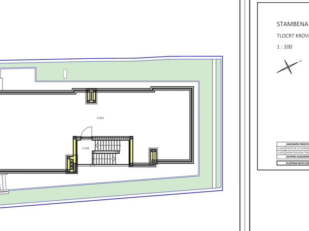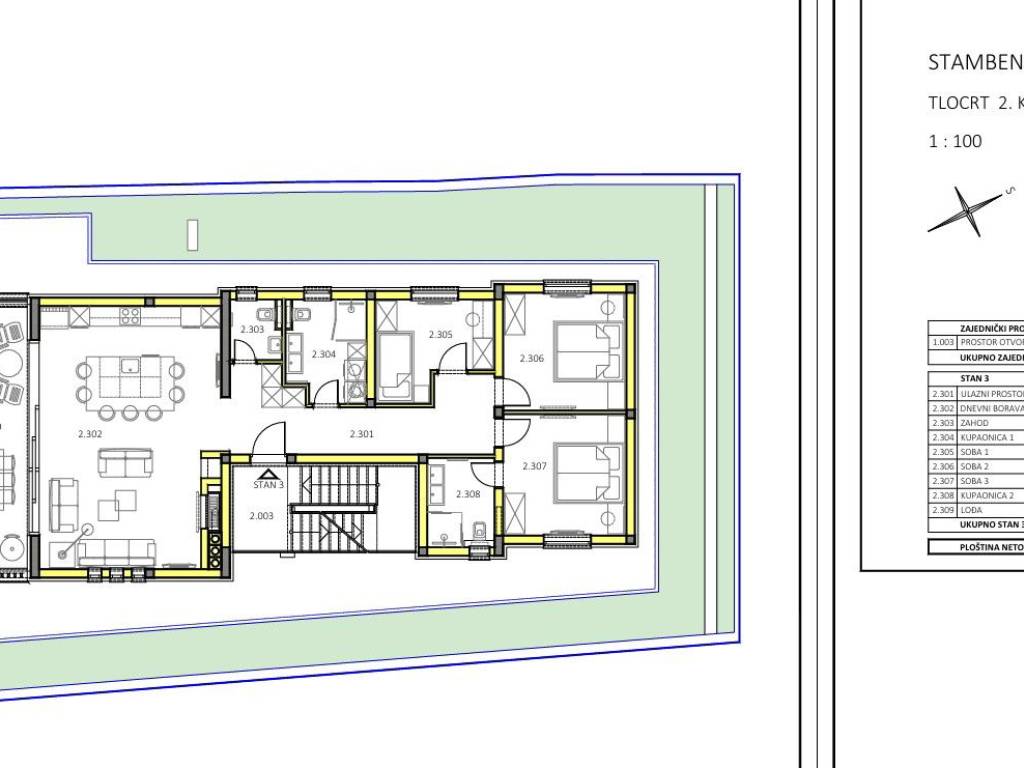 2nd floor - Apartment on the second floor of the building with a total net usable area of ​​149.88 m2 (net usable area with 2 parking spaces and an uncovered roof terrace of 129.40 m2, calculated 25.88 m2) and consists of an entrance hall, kitchen, dining room, spacious living room (40.42 m2) with access to a covered loggia of 16.77 m2, and 3 bedrooms, 2 bathrooms, and 1 separate toilet. Price: 975,000.00 EUR