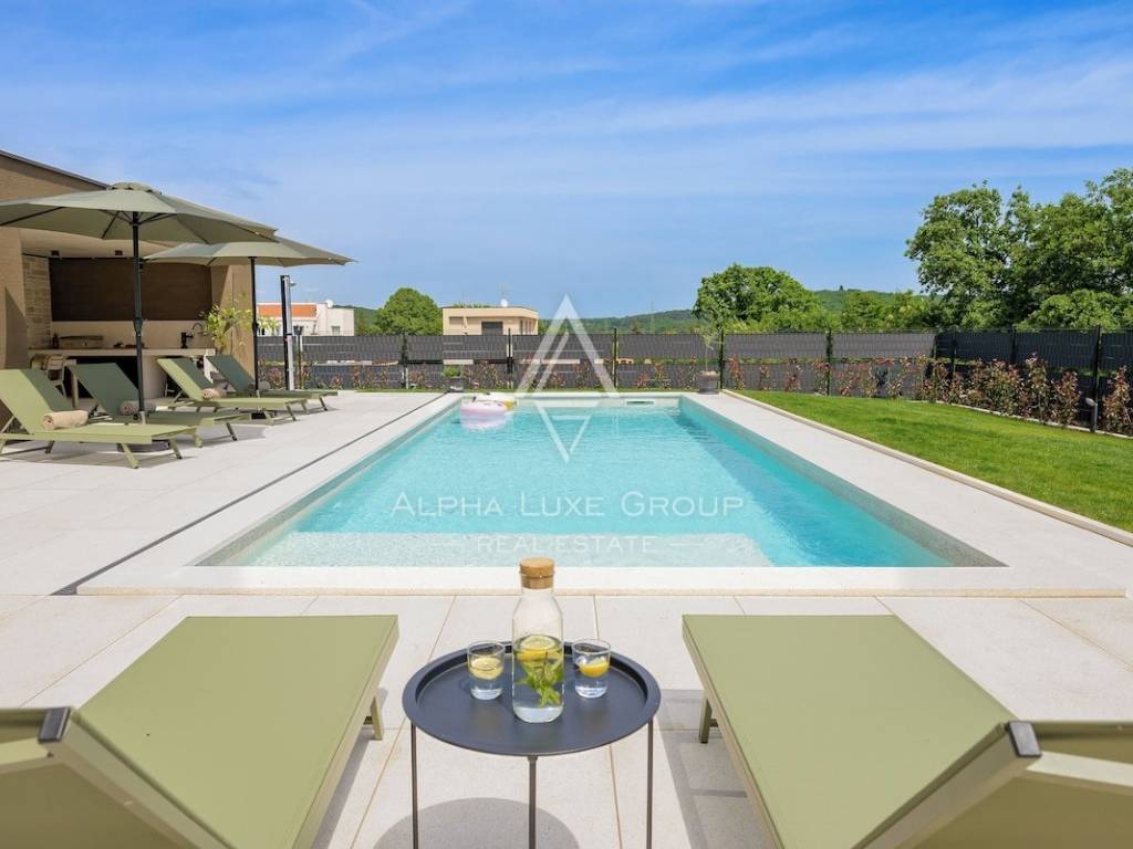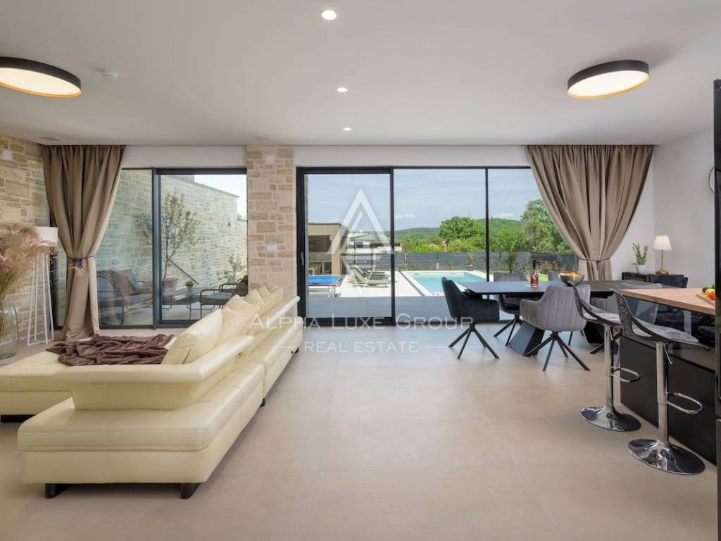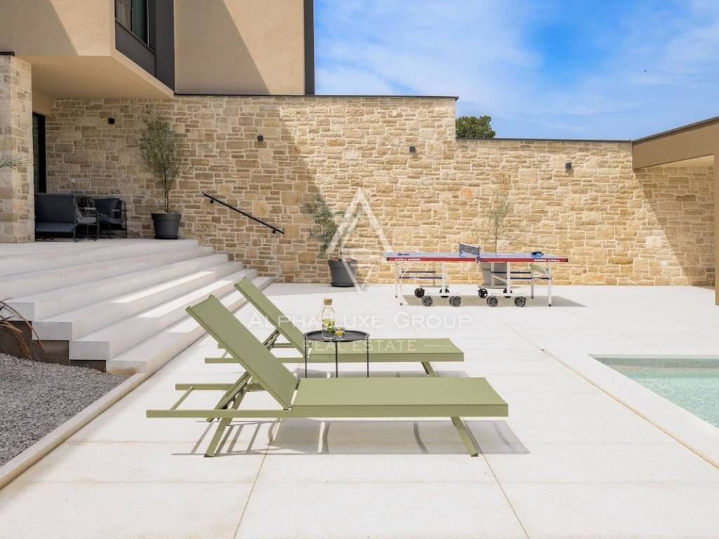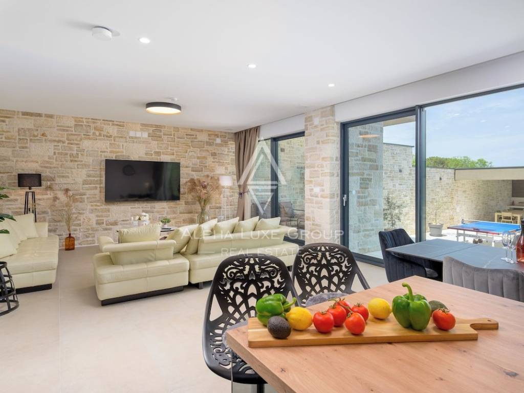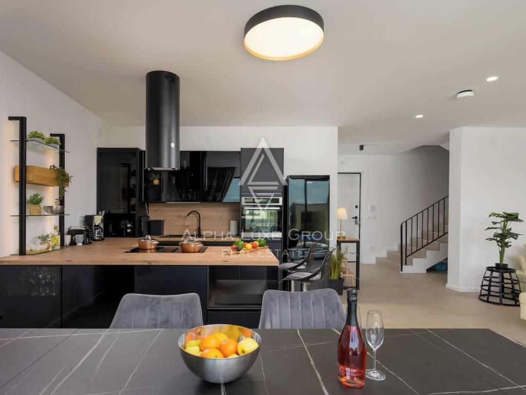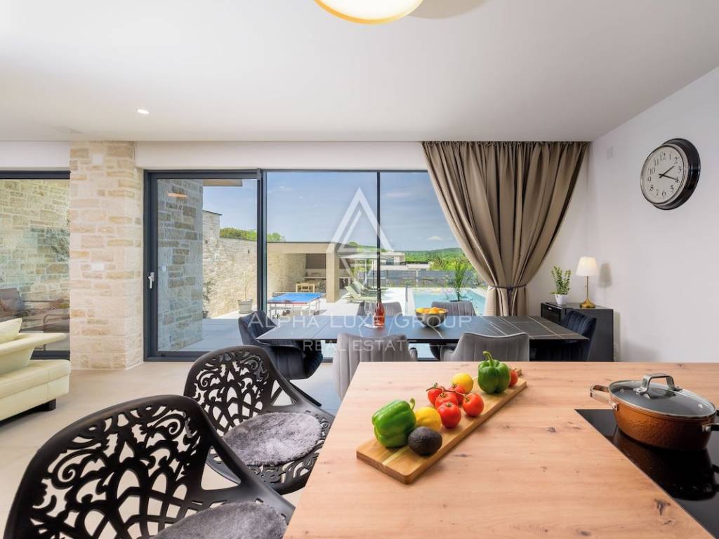 Questa villa contemporanea in vendita vicino a Rovigno offre un raffinato equilibrio tra design moderno, comfort e completa privacy. Situata in un tranquillo villaggio e circondata da un giardino paesaggistico di 550 m², la proprietà dispone di 216 m² di superficie interna distribuiti su due livelli. Il piano terra accoglie con un ampio ingresso, un bagno per gli ospiti e un luminoso soggiorno open space che si collega perfettamente alla cucina Veneta Cucine e alla zona pranzo. Le ampie pareti vetrate lungo la facciata principale illuminano naturalmente gli interni e offrono una vista continua sul giardino. Su questo livello si trova anche la camera padronale con bagno privato e accesso diretto al giardino, oltre a un comodo ripostiglio con accesso esterno.