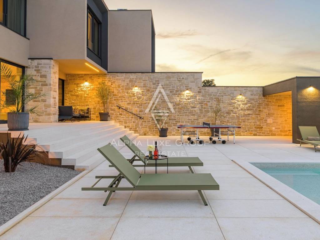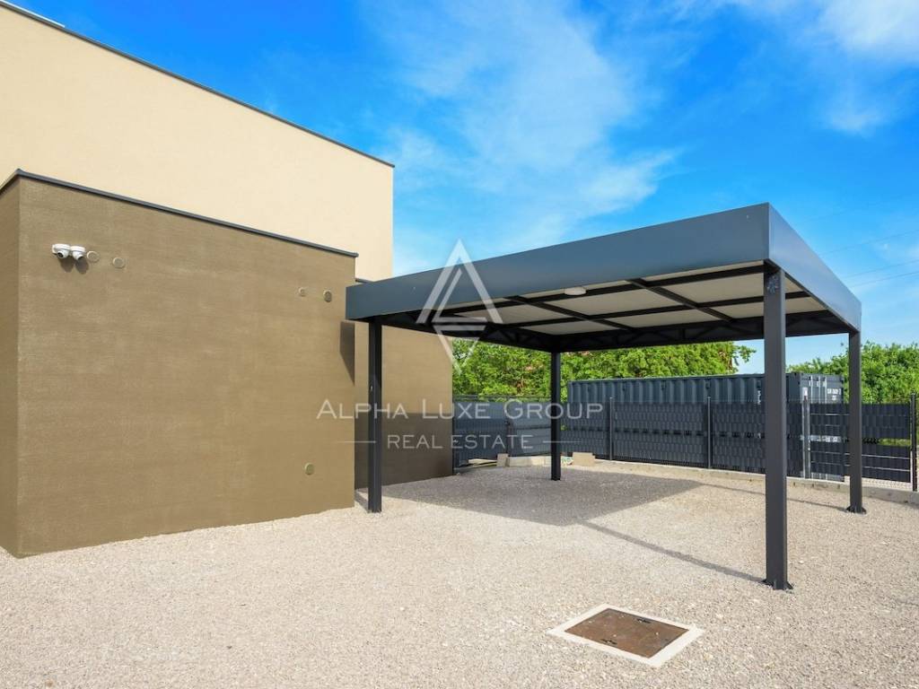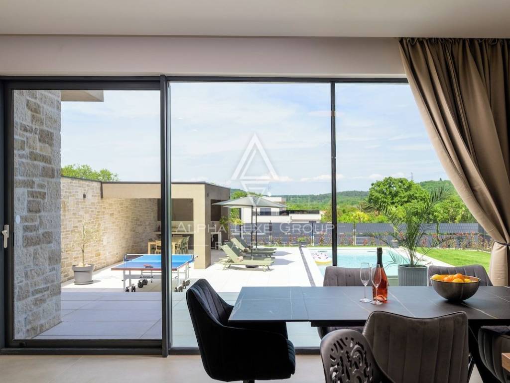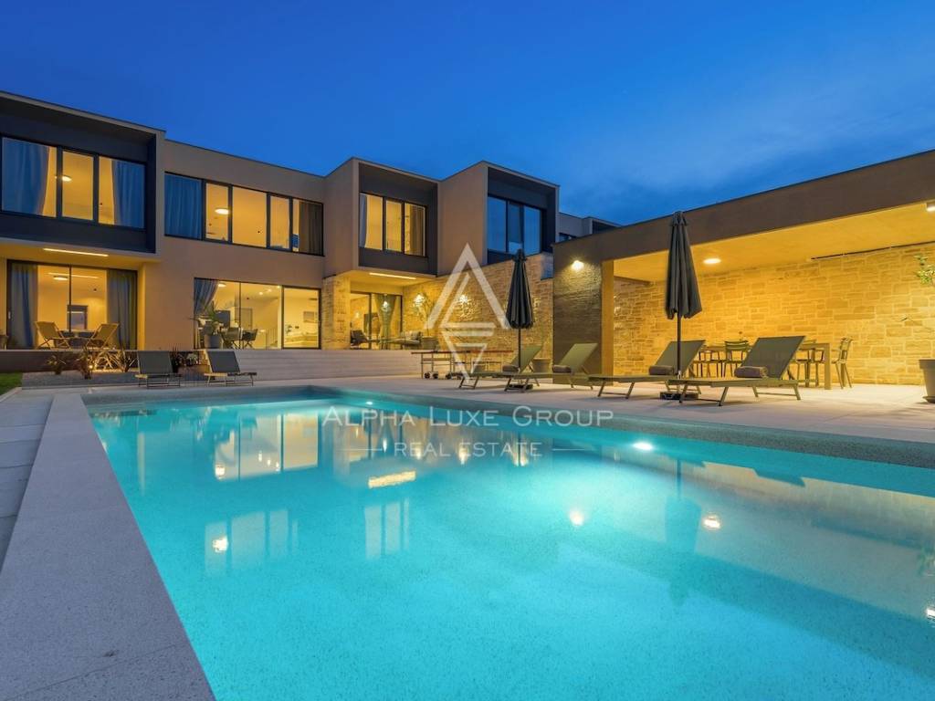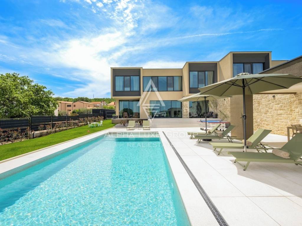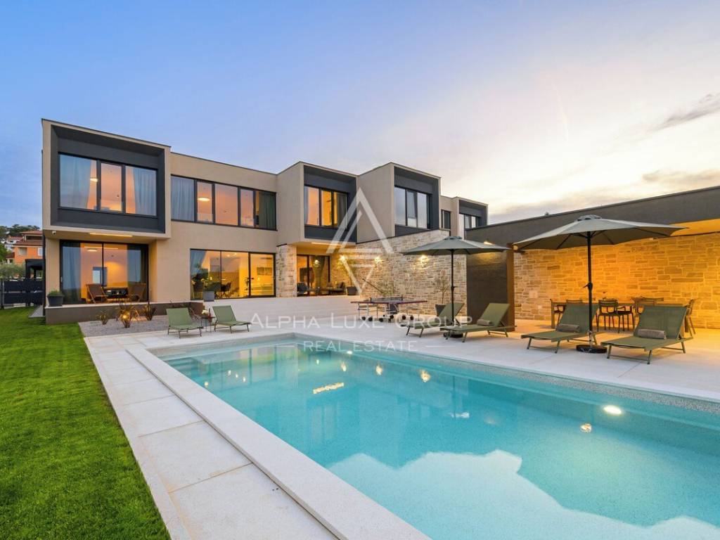 Questa villa contemporanea in vendita vicino a Rovigno offre un raffinato equilibrio tra design moderno, comfort e completa privacy. Situata in un tranquillo villaggio e circondata da un giardino paesaggistico di 550 m², la proprietà dispone di 216 m² di superficie interna distribuiti su due livelli. Il piano terra accoglie con un ampio ingresso, un bagno per gli ospiti e un luminoso soggiorno open space che si collega perfettamente alla cucina Veneta Cucine e alla zona pranzo. Le ampie pareti vetrate lungo la facciata principale illuminano naturalmente gli interni e offrono una vista continua sul giardino. Su questo livello si trova anche la camera padronale con bagno privato e accesso diretto al giardino, oltre a un comodo ripostiglio con accesso esterno.