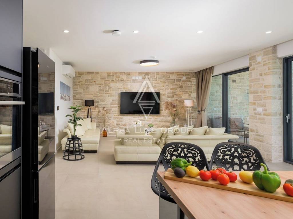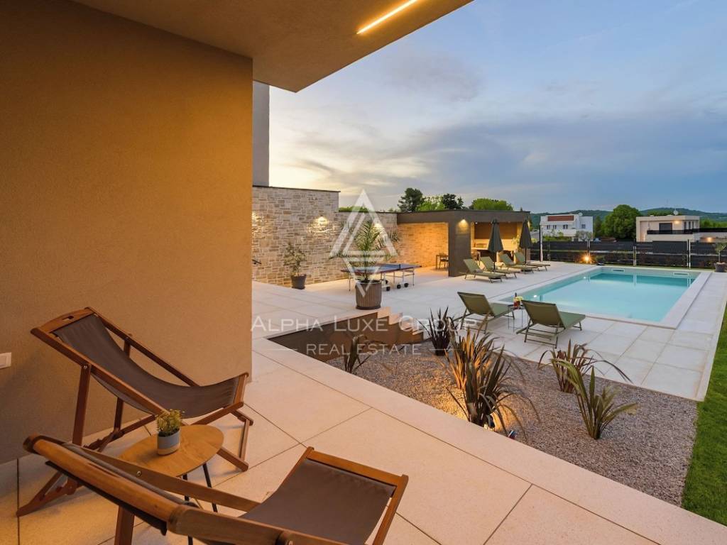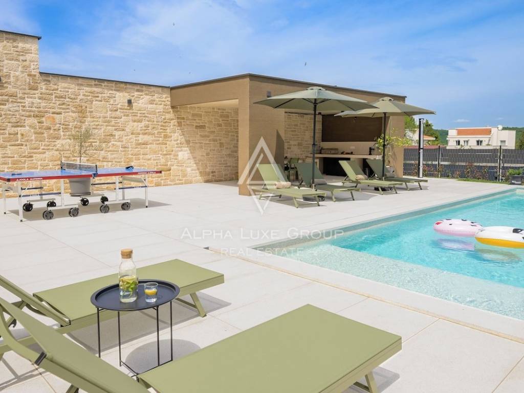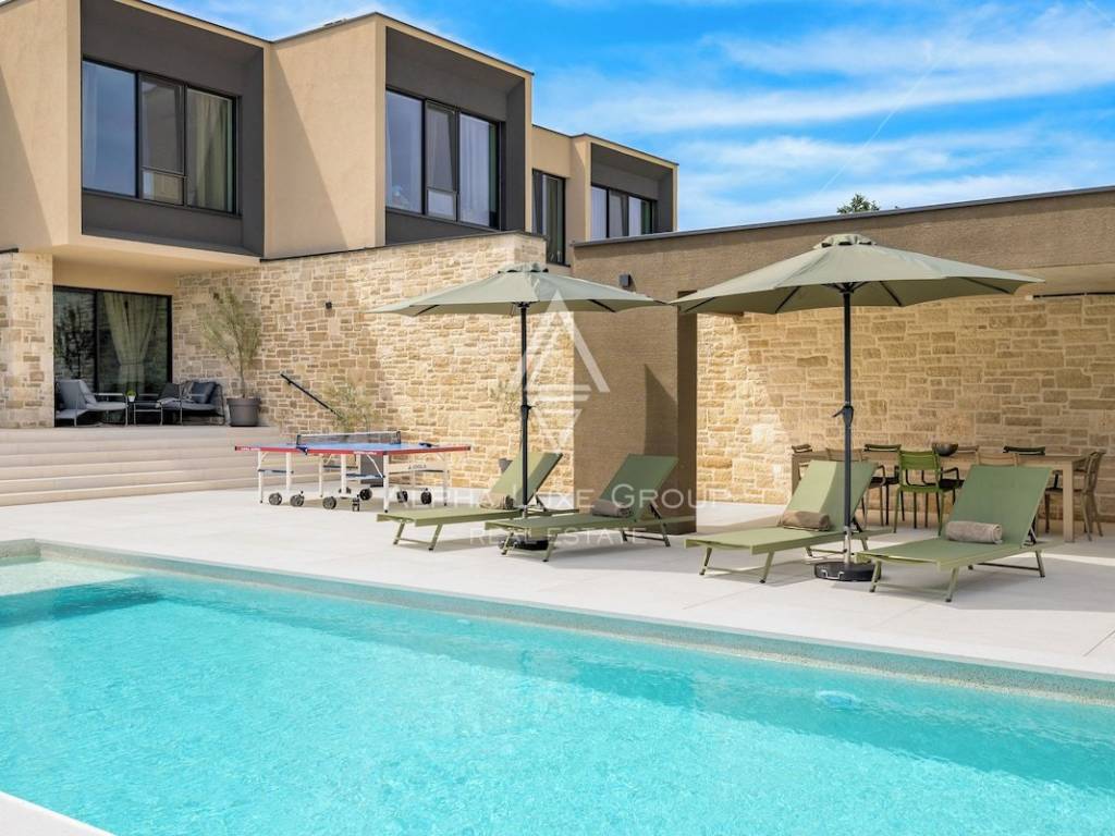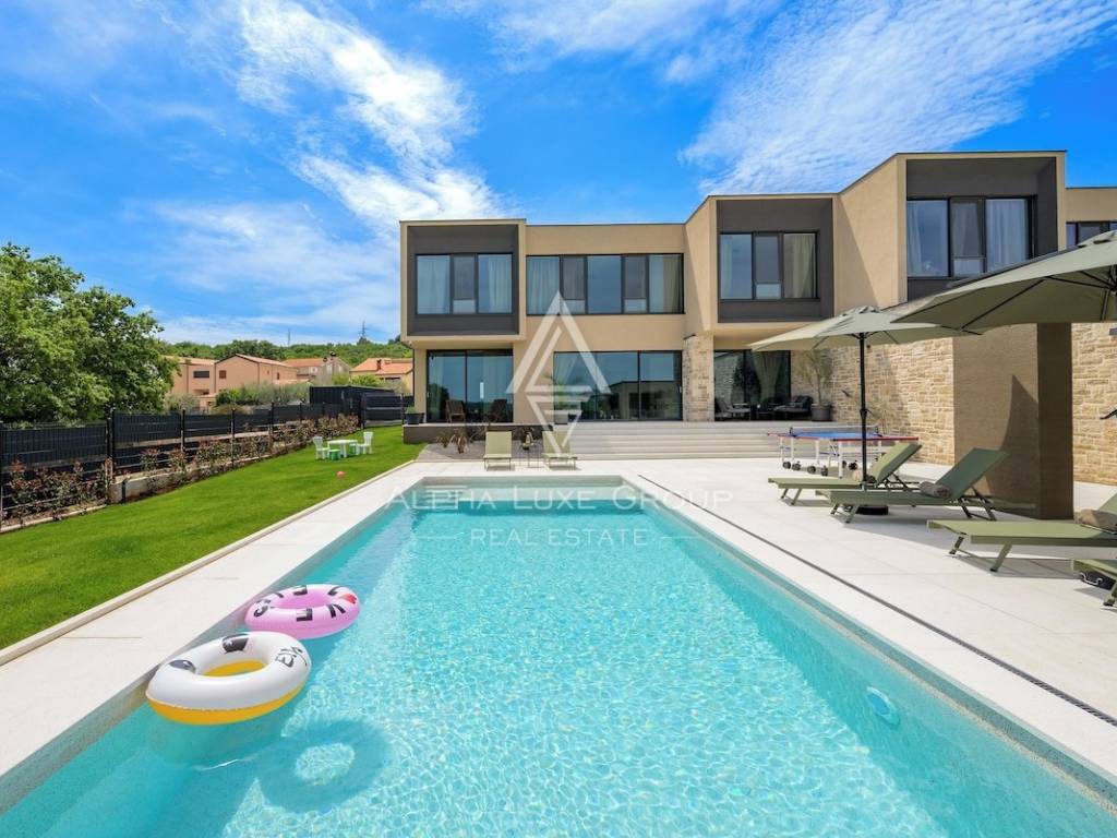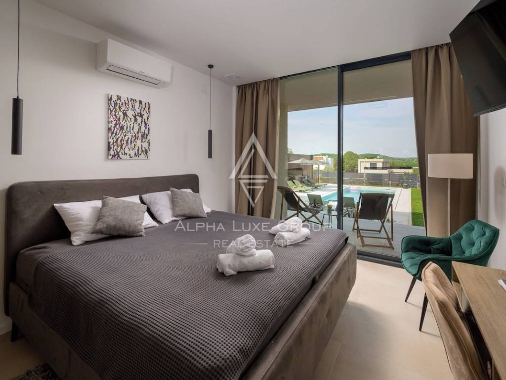 Questa villa contemporanea in vendita vicino a Rovigno offre un raffinato equilibrio tra design moderno, comfort e completa privacy. Situata in un tranquillo villaggio e circondata da un giardino paesaggistico di 550 m², la proprietà dispone di 216 m² di superficie interna distribuiti su due livelli. Il piano terra accoglie con un ampio ingresso, un bagno per gli ospiti e un luminoso soggiorno open space che si collega perfettamente alla cucina Veneta Cucine e alla zona pranzo. Le ampie pareti vetrate lungo la facciata principale illuminano naturalmente gli interni e offrono una vista continua sul giardino. Su questo livello si trova anche la camera padronale con bagno privato e accesso diretto al giardino, oltre a un comodo ripostiglio con accesso esterno.