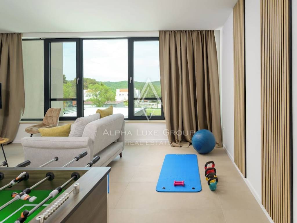 Il piano superiore ospita due camere da letto confortevoli, ciascuna con bagno privato, aria condizionata e TV, garantendo privacy e comodità per familiari e ospiti. Una stanza aggiuntiva di 42 m² è attualmente adibita a palestra e area giochi, con possibilità di trasformazione in ufficio, studio o suite aggiuntiva. La villa è dotata di riscaldamento elettrico a pavimento controllabile tramite Wi Fi e tutte le camere sono climatizzate, assicurando il massimo comfort durante tutto l’anno.