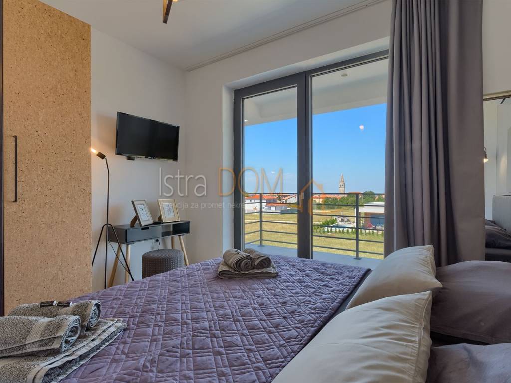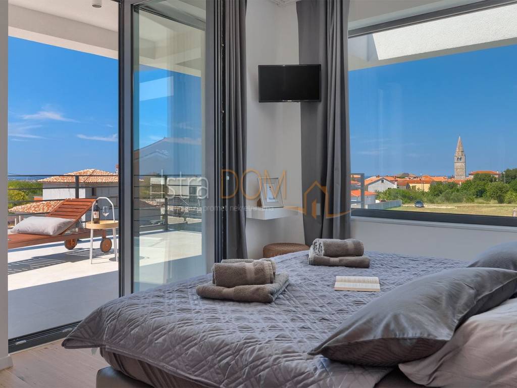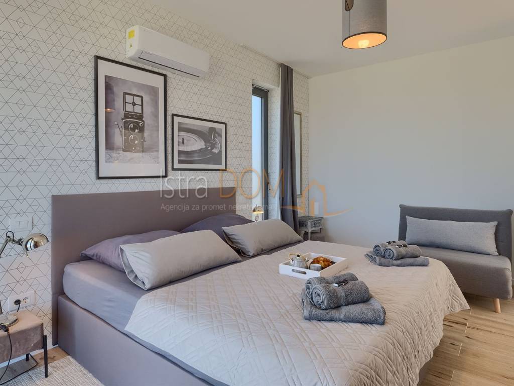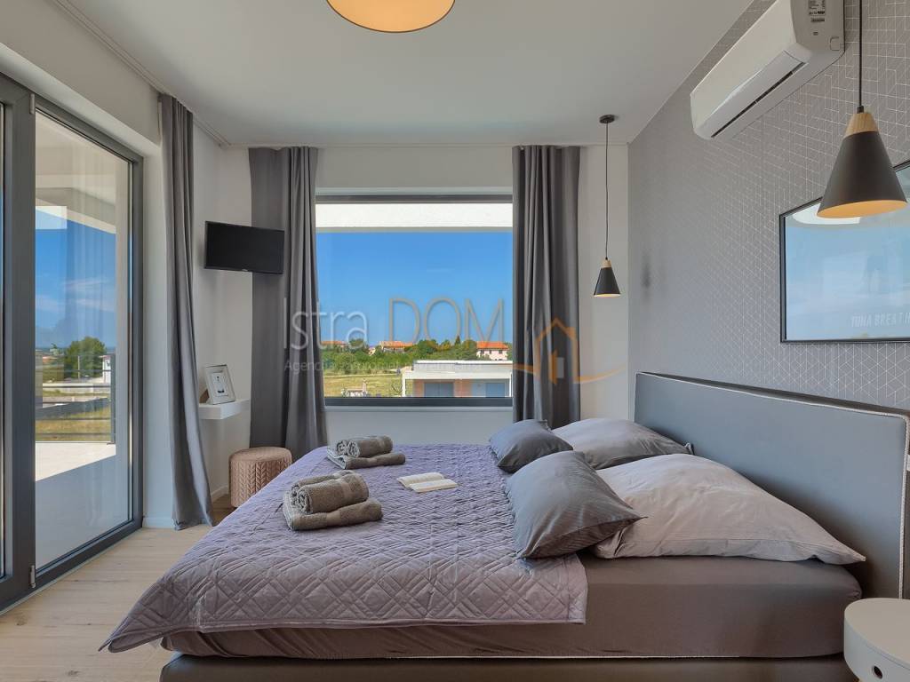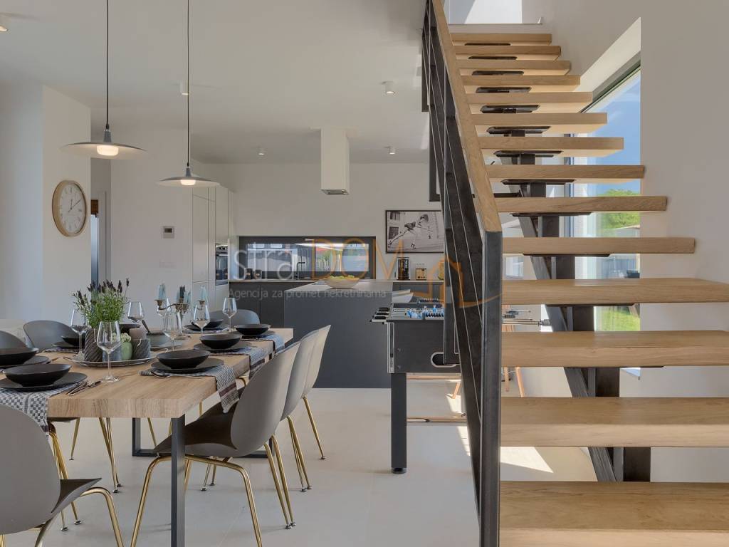 La villa si estende su una superficie abitabile complessiva di 136 m² ed è composta da un piano terra e un piano superiore. Al piano terra si trova un ampio open space con cucina completamente attrezzata, soggiorno, sala da pranzo e un bagno per gli ospiti. Le grandi vetrate al piano terra offrono una splendida vista sulla piscina, sul giardino con cucina esterna attrezzata e barbecue e permettono inoltre di godere di una vista panoramica sui dintorni, sul verde e sulle isole Brioni.