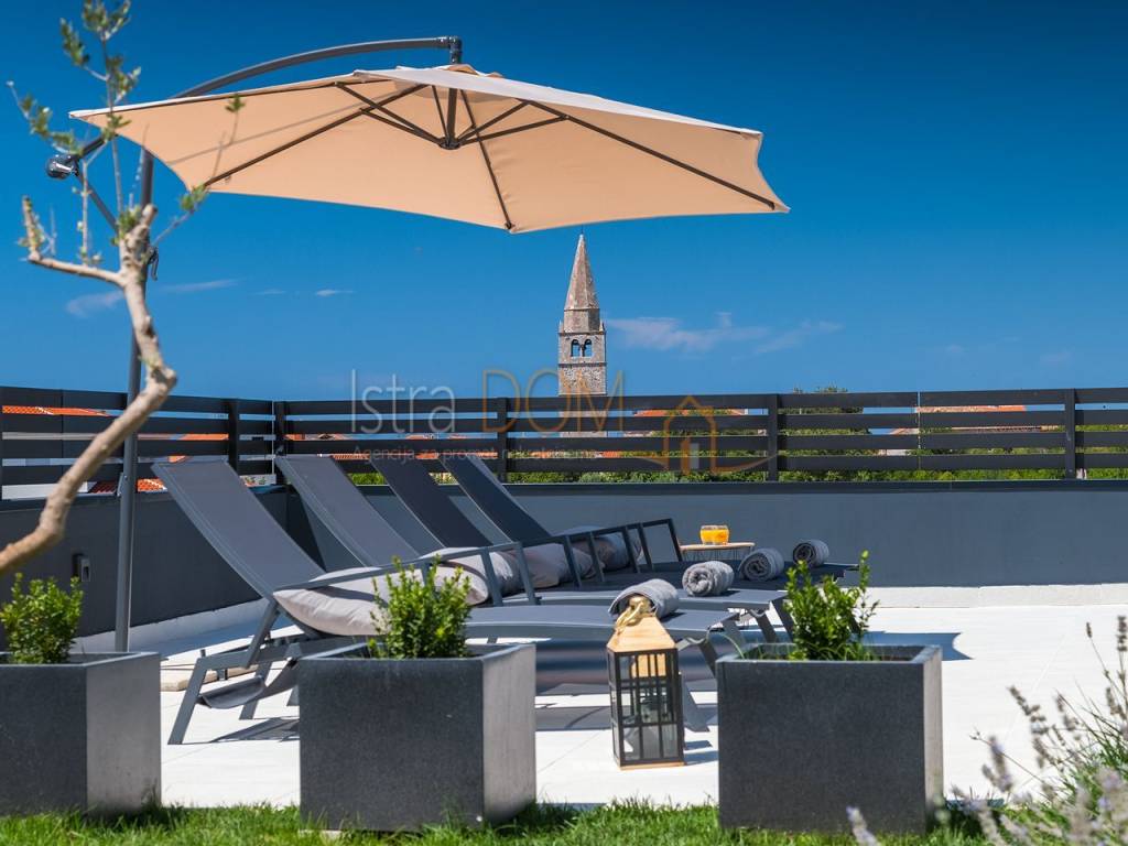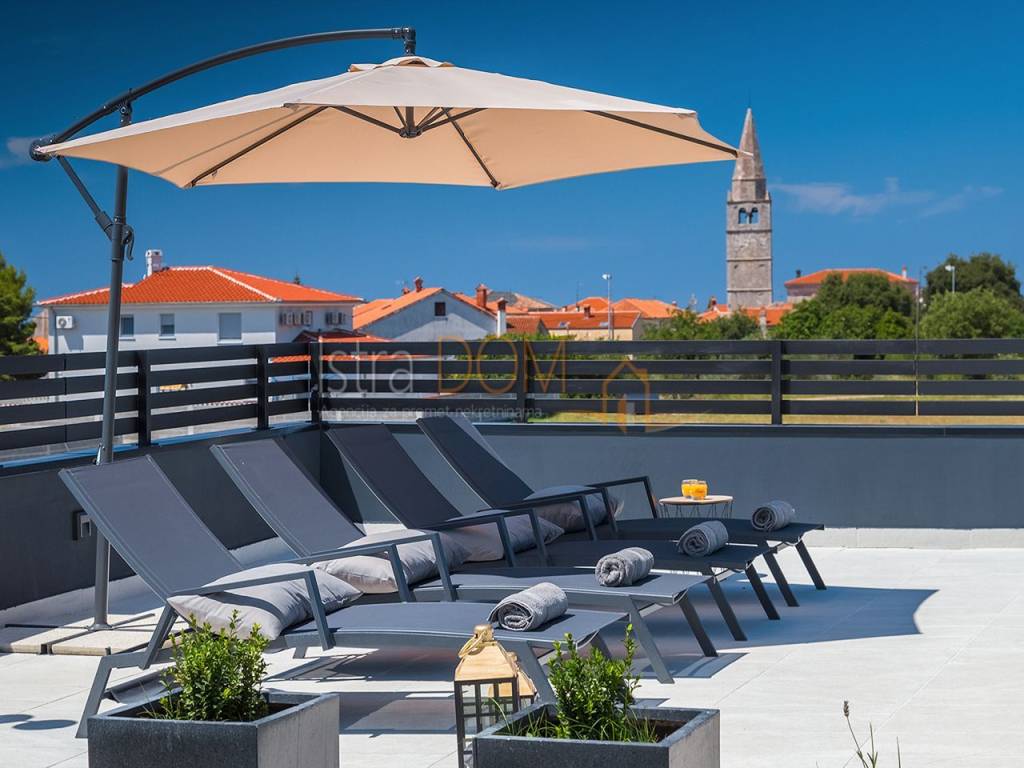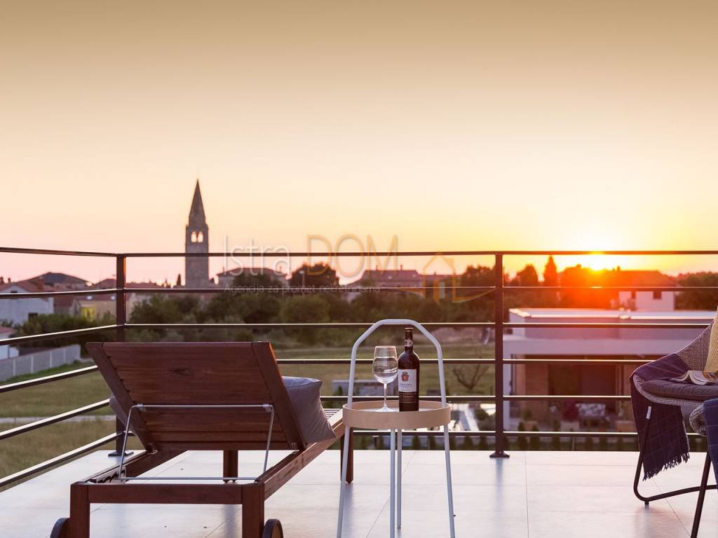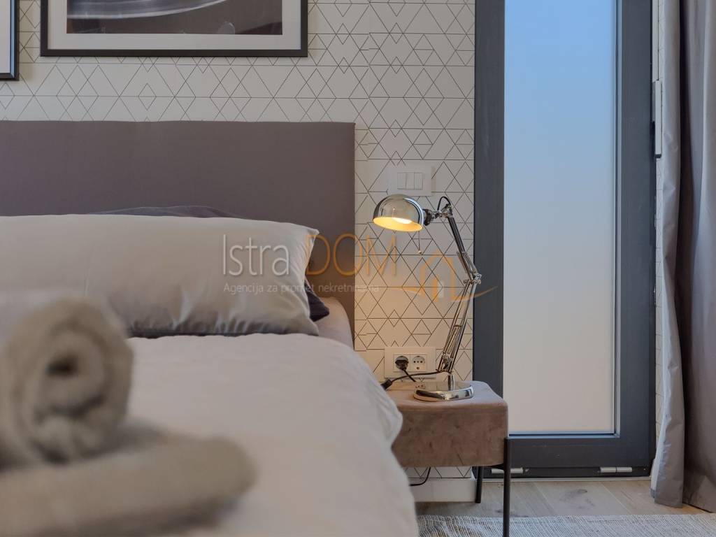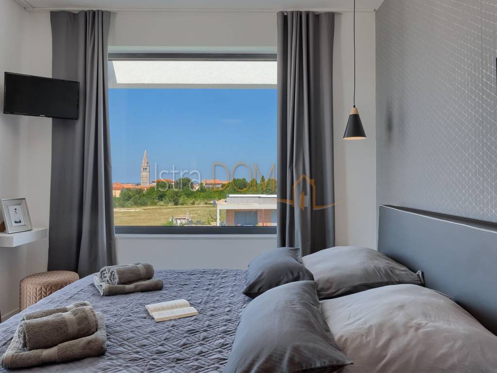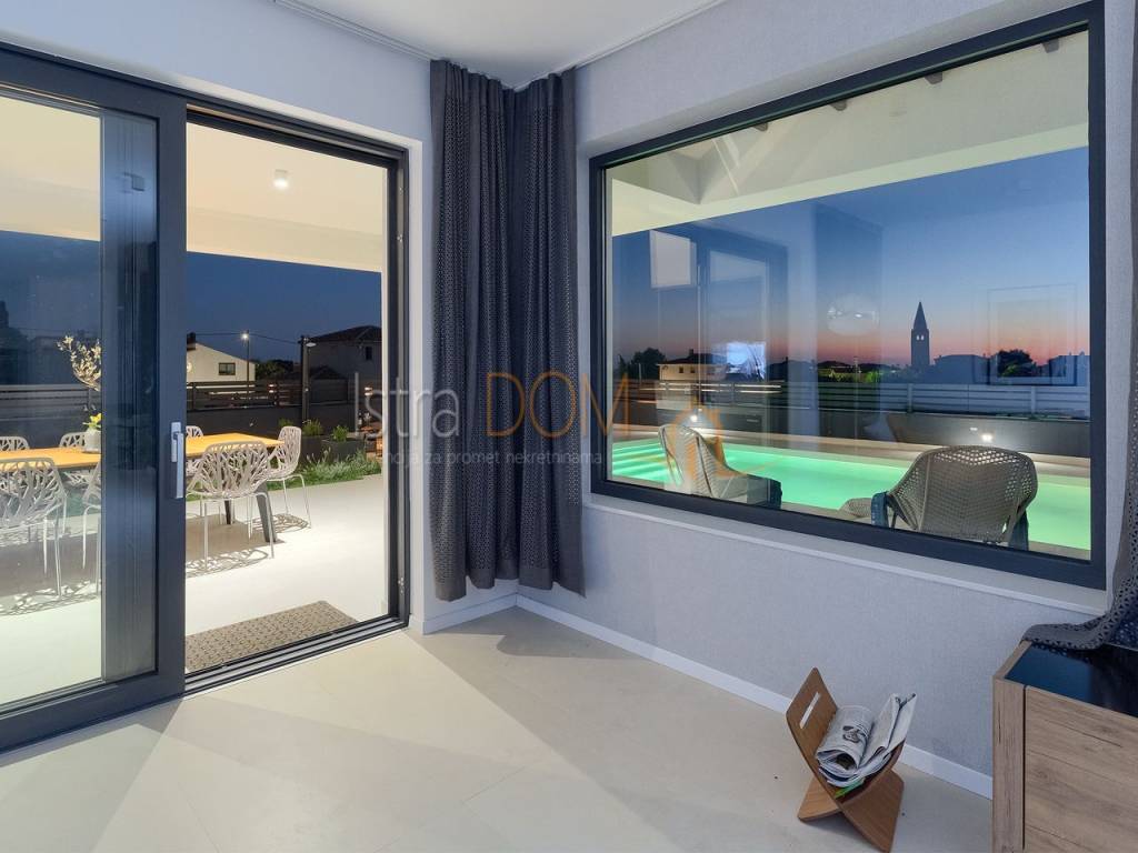 La villa si estende su una superficie abitabile complessiva di 136 m² ed è composta da un piano terra e un piano superiore. Al piano terra si trova un ampio open space con cucina completamente attrezzata, soggiorno, sala da pranzo e un bagno per gli ospiti. Le grandi vetrate al piano terra offrono una splendida vista sulla piscina, sul giardino con cucina esterna attrezzata e barbecue e permettono inoltre di godere di una vista panoramica sui dintorni, sul verde e sulle isole Brioni.