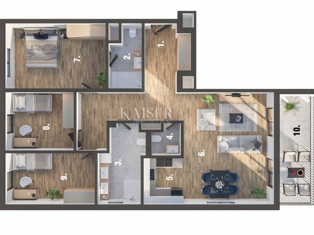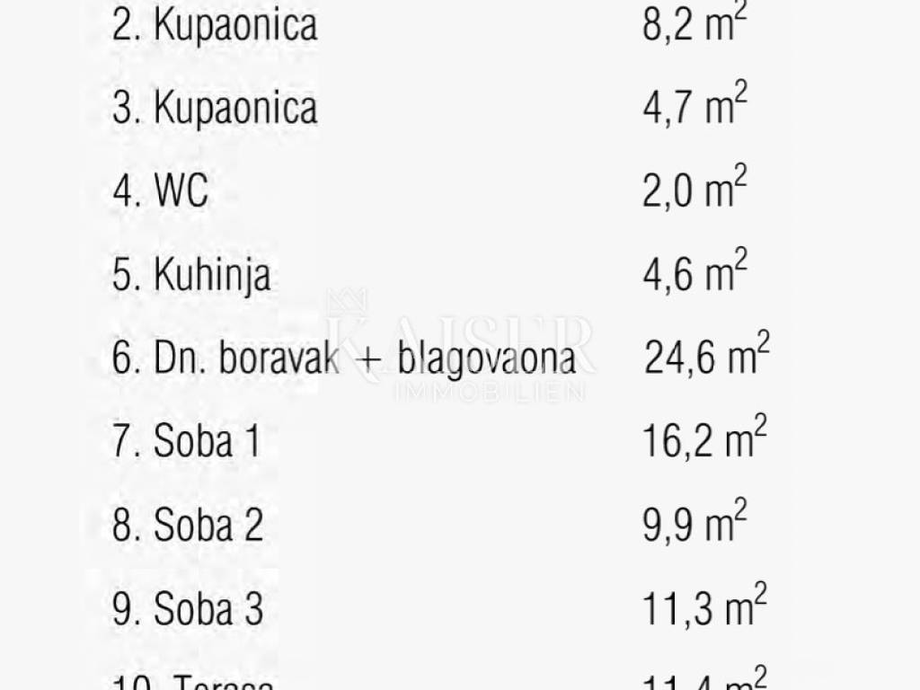 Kaiser Immobilien commercializza in esclusiva un nuovo progetto a Martinkovac. Presentiamo un meraviglioso appartamento con una superficie netta di 109,3 m2 (superficie totale = 113 m2). L'appartamento dispone di tre camere da letto con soggiorno, è dotato di due bagni e servizi igienici separati, in cui è installato il riscaldamento a pavimento, mentre l'intero appartamento è dotato di impianto di riscaldamento, aria condizionata e ventilazione. L'appartamento si trova in un moderno edificio residenziale con ascensore, orientamento nord-ovest e sud. L'appartamento dispone di due posti auto coperti e un ripostiglio. L'acquirente non paga l'imposta sugli immobili. Il completamento previsto dei lavori e dell'occupazione è nel 2024. Per ulteriori informazioni contattare con fiducia.