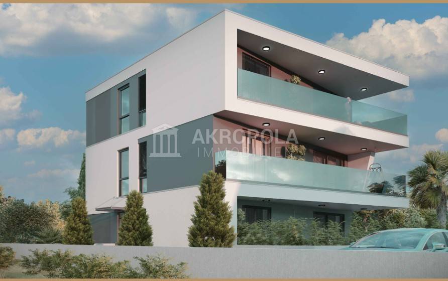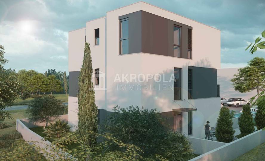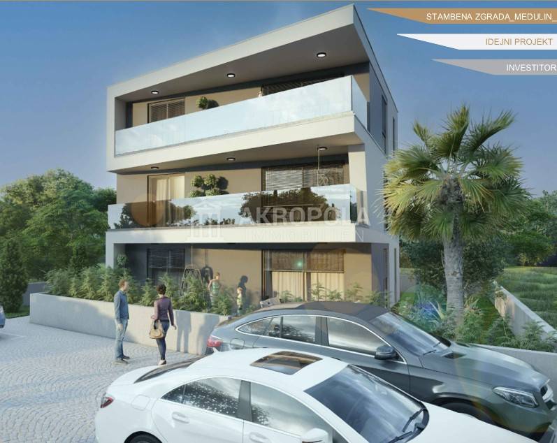 Istria/Medulin, apartment for sale in a new building. Ground floor apartment with a garden in a residential building 80.14 m2, + 2 parking spaces. Total 85.14 m². Building with 3 apartments. Distance from the sea 850 meters. The apartment consists of an entrance hall, two bedrooms, living room with kitchen and dining room, utility room and spacious terrace. 2 parking spaces.