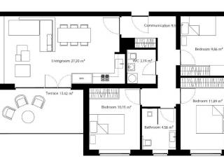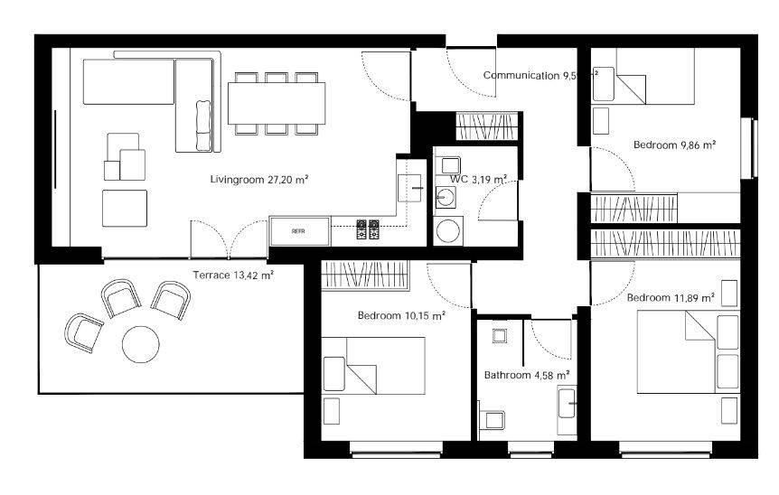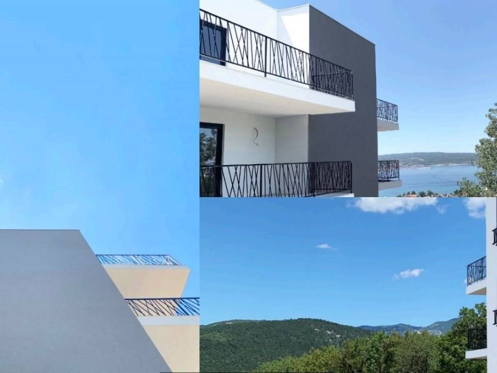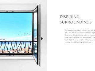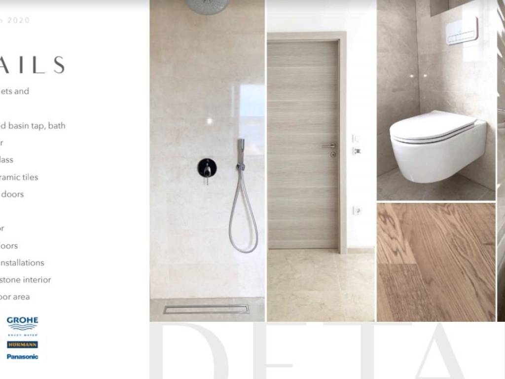 Only the highest quality equipment is installed in the apartment. The floors in the living room and in the bedrooms are made of first-class oak multilayer parquet. The ceramics in the bathrooms and corridors are first-class Italian ceramics of a large format, sometimes with relief processing. The bathroom faucet and shower head, handset and battery are from the GROHE Essence line, with flush mounting. The sink is Villeroy-Boch, the WC is Villeroy-Boch slim line, rimless with direct flush flushing and a slim slow-down seat. The kettles are also Villeroy-Boch. The bathrooms are equipped with electric underfloor heating. Exterior carpentry is wood-aluminum, large format. The two bedrooms are equipped with semi-French windows measuring 180 x 170 cm and offer an incredible view even while lying in bed. The living room has a glass shade measuring 320 x 240 cm. All electrical installations are made by Panasonic, and all rooms have internet and satellite TV installed. Each room is air-conditioned. The interior door is additionally soundproofed. The entrance security door is Dierre, a well-known Italian manufacturer. On the roof there is a roof terrace, where water, drainage and electricity are installed and a Jacuzzi, summer kitchen or BBQ can be installed. The roof terrace is not for shared use but is purchased separately and is not included in the price of the apartment. The surroundings of the buildings are richly decorated with autochthonous plant species.
