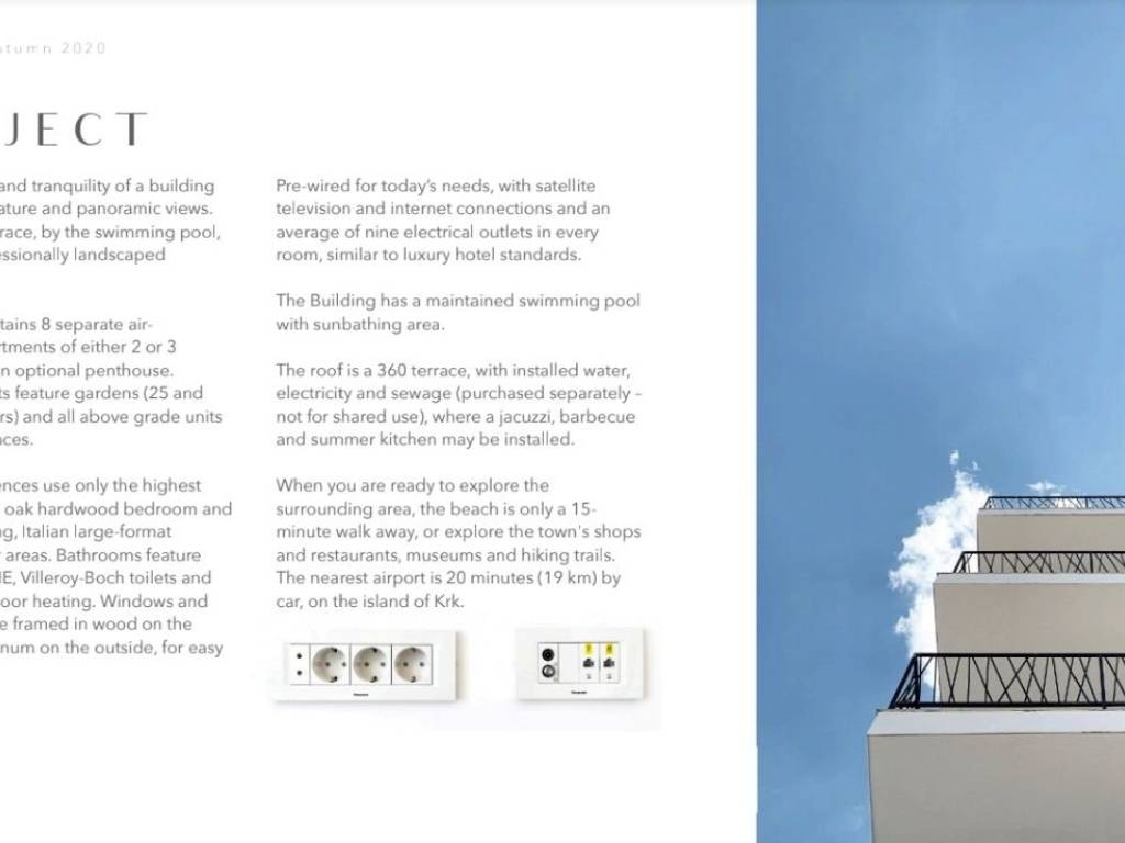 The building is located on the edge of the green belt, without city noise and traffic, in an elevated position, and only about 15 minutes' walk from the Crikvenica waterfront. The maintenance of the swimming pool is regulated by a reserve and the tenants have the experience of a hotel swimming pool - there are no obligations.