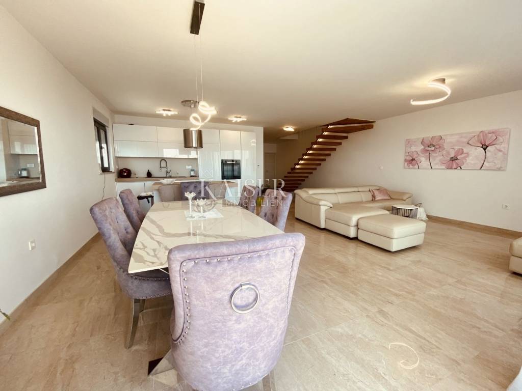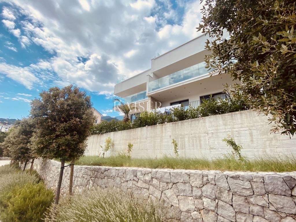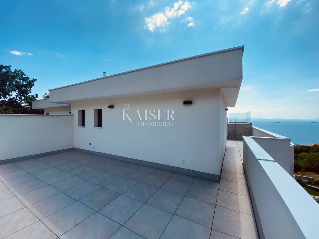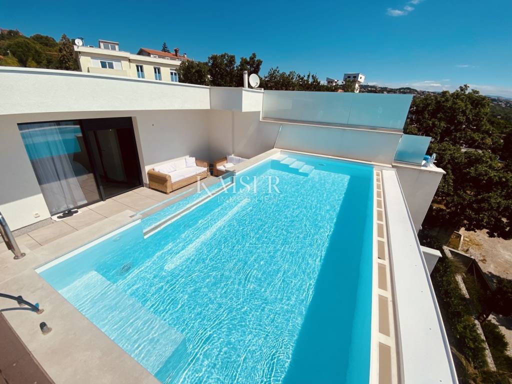 Kaiser Immobilien mette sul mercato una moderna villa bifamiliare con orientamento sud-est e una superficie abitabile di 250 mq, composta da seminterrato, piano terra, piano rialzato e primo piano. Nel seminterrato della casa c'è un garage, un locale ausiliario / officina e un locale caldaia. L'ingresso principale della villa ci conduce al piano rialzato, dove troviamo un ampio soggiorno con sala da pranzo e cucina, 1 camera da letto con annesso bagno e un comodo guardaroba. Possiamo utilizzare la scala interna per scendere al piano terra o salire al 1° piano. Al piano terra ci sono 2 camere da letto, ognuna con il proprio bagno e un ampio terrazzo, un ampio locale per palestra domestica o sala giochi per bambini e un ripostiglio con lavatrice. Al 1° piano si trova la camera da letto principale, sempre con il proprio bagno, e una bellissima terrazza con piscina a sfioro e una fantastica vista sul mare, su Fiume e sull'intero Golfo del Quarnero. Questa terrazza è collegata ad un'altra grande terrazza situata sul lato nord-ovest opposto della casa e offre ai proprietari una piacevole ombra durante le giornate calde e una splendida vista sull'Učka e sui tramonti. La casa è costruita con materiali di alta qualità e ha una disposizione interna ben studiata. Le sale comuni sono in primo piano, e le camere da letto elegantemente disposte offrono agli abitanti della casa la massima tranquillità e privacy. In tutta la casa sono stati installati impianti elettrici di riscaldamento a pavimento e aria condizionata per il raffreddamento e il riscaldamento. La casa appartiene alla classe energetica A+. Ci sono almeno 4 posti auto disponibili intorno alla casa e 1 veicolo può essere parcheggiato nel garage. Il cortile della villa ha una superficie di 416 mq e davanti alla casa c'è un piccolo giardino con piante mediterranee e agrumi.