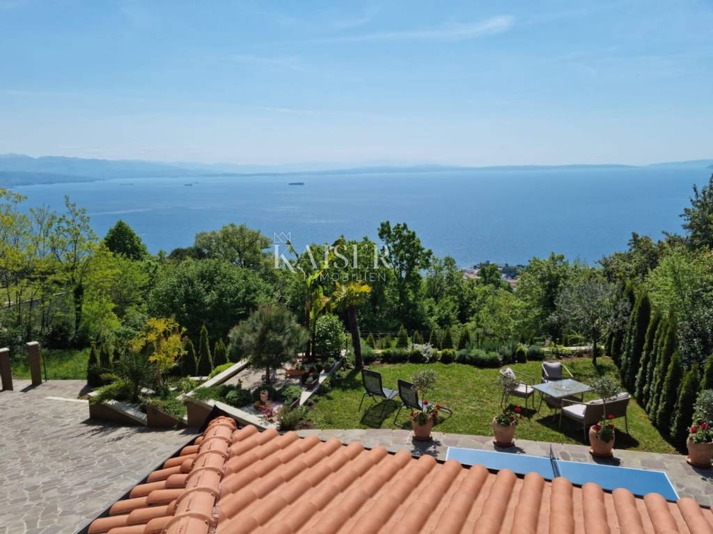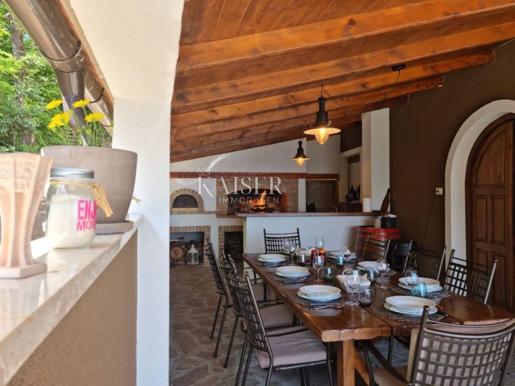 Una proprietà eccezionale sulle pendici del Parco Naturale dell'Učka con vista sull'intero Golfo del Quarnero, sulle isole di Krk e Cres e sulla nostra piccola ma famosa stazione sciistica di Platka. Tutto questo e molto altro è a tua disposizione da questa meravigliosa proprietà in una posizione tranquilla e una casa con un'energia estremamente positiva. Concetto familiare, il cui piano terra è dominato da un ampio garage con la più bella vista sul tin pet, locale caldaia con riscaldamento centralizzato a pellet e caldaia da 300 L per l'acqua calda, cucina lavanderia, dispensa, un servizio igienico, taverna interna e taverna esterna - sotto una veranda coperta che dispone di cucina esterna completamente attrezzata, forno per il pane in muratura, grill e piano cottura a gas, acqua calda e fredda e attrezzature per ospitare 24 persone, luogo ideale per riunioni e riunioni di famiglia. L'esposizione della casa garantisce completa privacy dagli scorci vicini. Attraverso la taverna interna e il garage, il resto della casa è collegato alla parte abitativa della casa da un'ampia scala. Il primo piano è dominato da un ampio atrio, doppie porte che conducono alla sala da pranzo e al soggiorno e una cucina funzionale e spaziosa separata da una porta click-clack. Soggiorno attrezzato con mobili Natuzzi, sala da pranzo Calligaris con tavolo allungabile da 6 a 12 posti. Accanto all'ingresso principale della casa c'è un ampio bagno con cabina doccia e 1 camera da letto per due persone e una scrivania, con mobili realizzati con materiali di alta qualità realizzati su misura. Al secondo piano troviamo un disimpegno in galleria, un bagno padronale con cabina doccia e vasca idromassaggio e servizi igienici. Due camerette con vista mare, una matrimoniale con cabina armadio da cui si accede anche alla mansarda della casa. La casa è dotata di costosi mobili su misura e mobili di design comodamente inseriti in uno spazio che è una casa spaziosa e accogliente per la famiglia. Tutto dentro e intorno alla casa è organizzato e curato in modo che possa essere spostato immediatamente e offre un comfort eccezionale, privacy ed edonismo disponibili tutti i giorni.